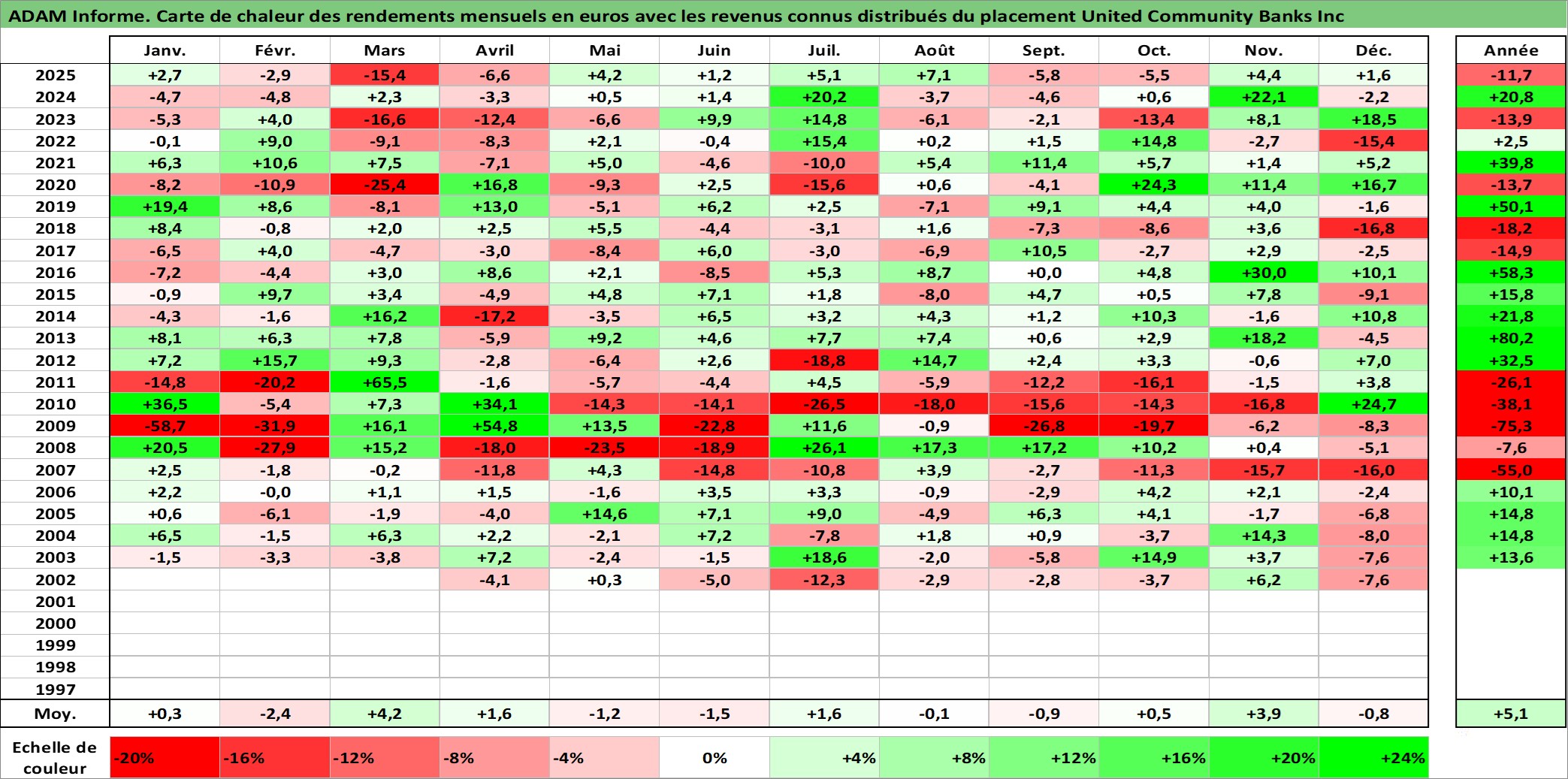 Site dédié aux investisseursPage dédiée sur site financeAnalyse des valorisations hebdomadaires de l'action United Community Banks Inc. Cet actif est cote en USD. Les valorisations sont en contrevaleur EURO et couvrent les semaines 2002W12 a 2026W01. Les revenus de cet actif financier sont pris en compte depuis la semaine 2002W24. La note ESG de cet actif n'est pas connue.