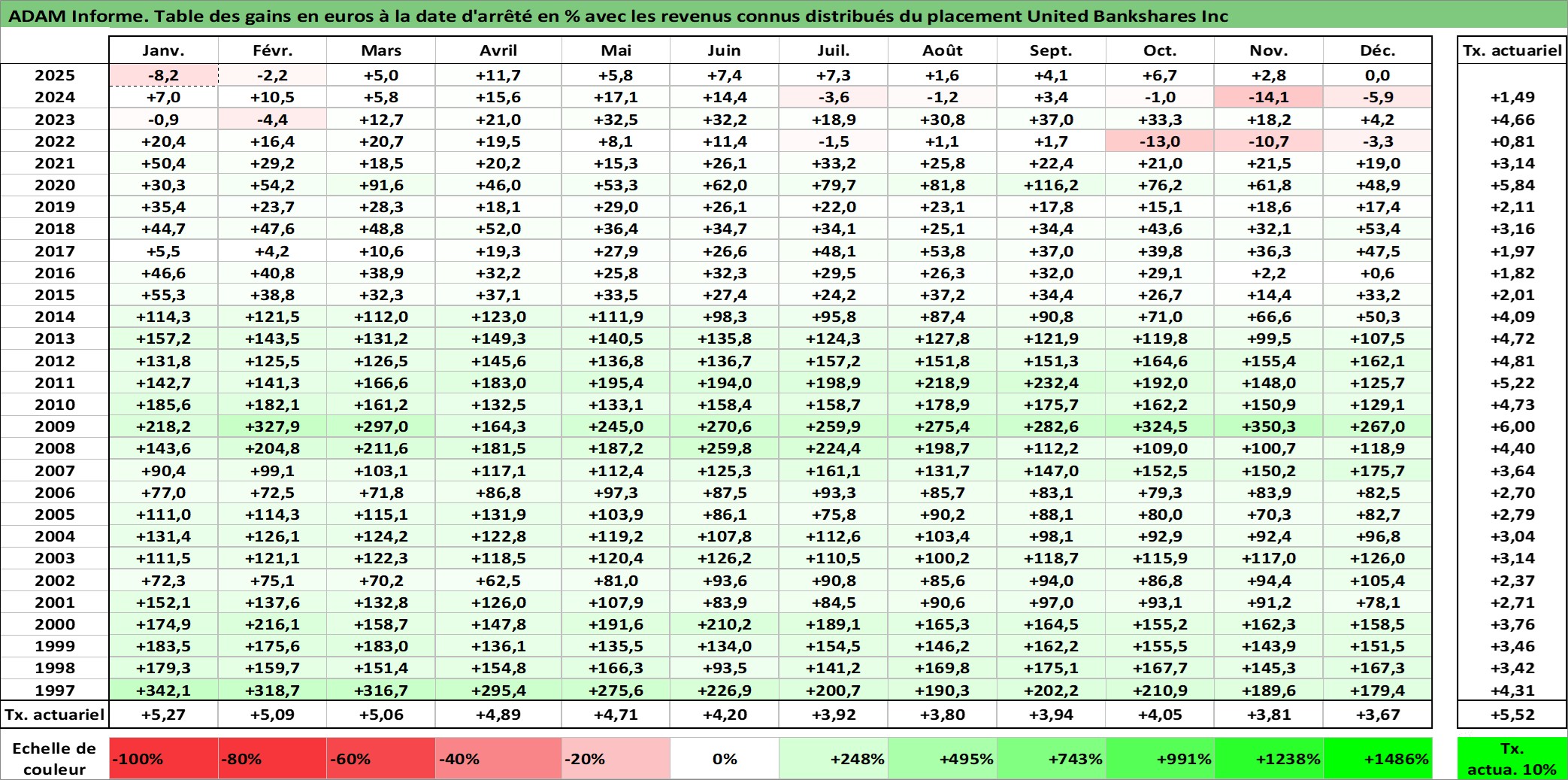 Site dédié aux investisseursPage dédiée sur site financeAnalyse des valorisations hebdomadaires de l'action United Bankshares Inc. Cet actif est cote en USD. Les valorisations sont en contrevaleur EURO et couvrent les semaines 1997W01 a 2026W01. Les revenus de cet actif financier sont pris en compte depuis la semaine 1997W11. La note ESG de cet actif n'est pas connue.
