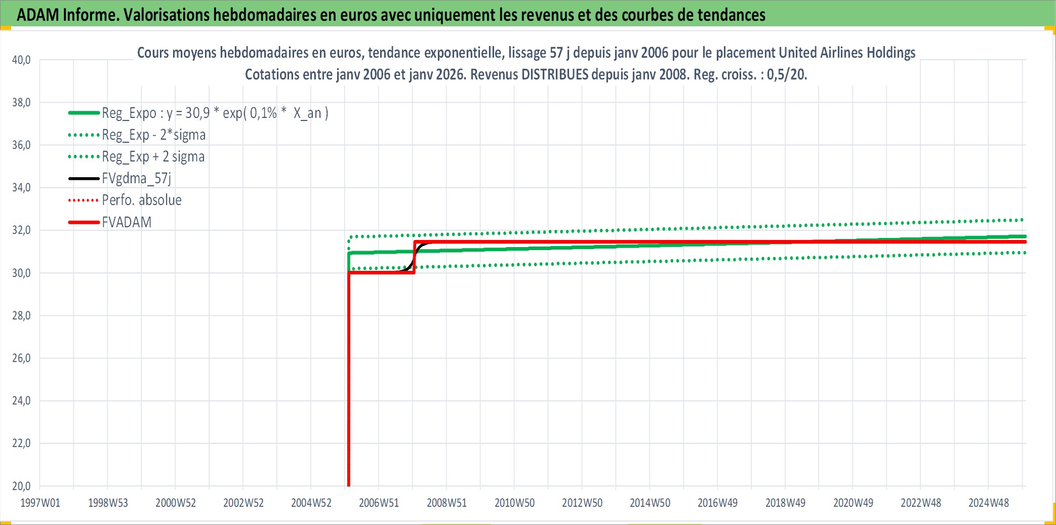 Site dédié aux investisseursPage dédiée sur site financeAnalyse des valorisations hebdomadaires de l'action United Airlines Holdings Inc. Cet actif est cote en USD. Les valorisations sont en contrevaleur EURO et couvrent les semaines 2006W05 a 2026W01. Les revenus de cet actif financier sont pris en compte depuis la semaine 2008W02. La note globale ESG de cet actif est estimee a 6.0 (apres rebasage entre 0 et 20).
