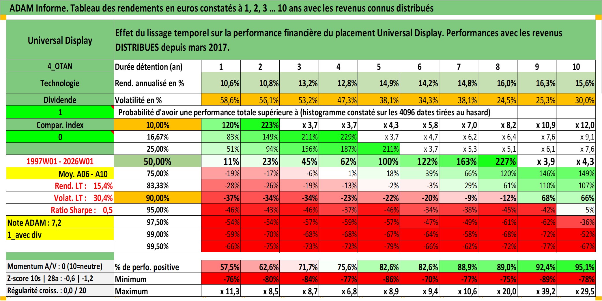 Site dédié aux investisseursPage dédiée sur site financeAnalyse des valorisations hebdomadaires de l'action Universal Display. Cet actif est cote en USD. Les valorisations sont en contrevaleur EURO et couvrent les semaines 1997W01 a 2026W01. Les revenus de cet actif financier sont pris en compte depuis la semaine 2017W11. La note ESG de cet actif n'est pas connue.