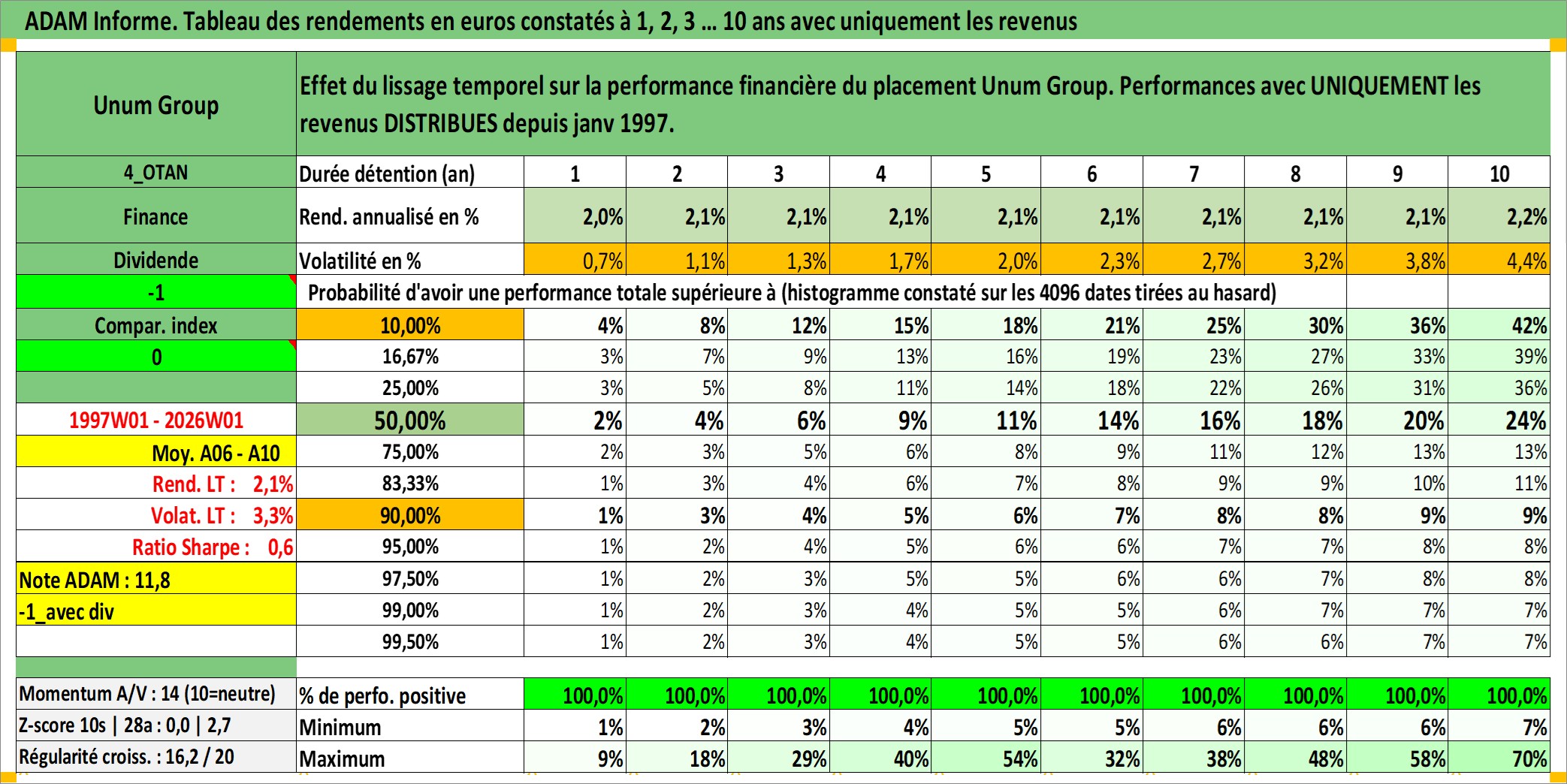 Site dédié aux investisseursPage dédiée sur site financeAnalyse des valorisations hebdomadaires de l'action Unum Group. Cet actif est cote en USD. Les valorisations sont en contrevaleur EURO et couvrent les semaines 1997W01 a 2026W01. Les revenus de cet actif financier sont pris en compte depuis la semaine 1997W04. La note globale ESG de cet actif est estimee a 12.0 (apres rebasage entre 0 et 20).