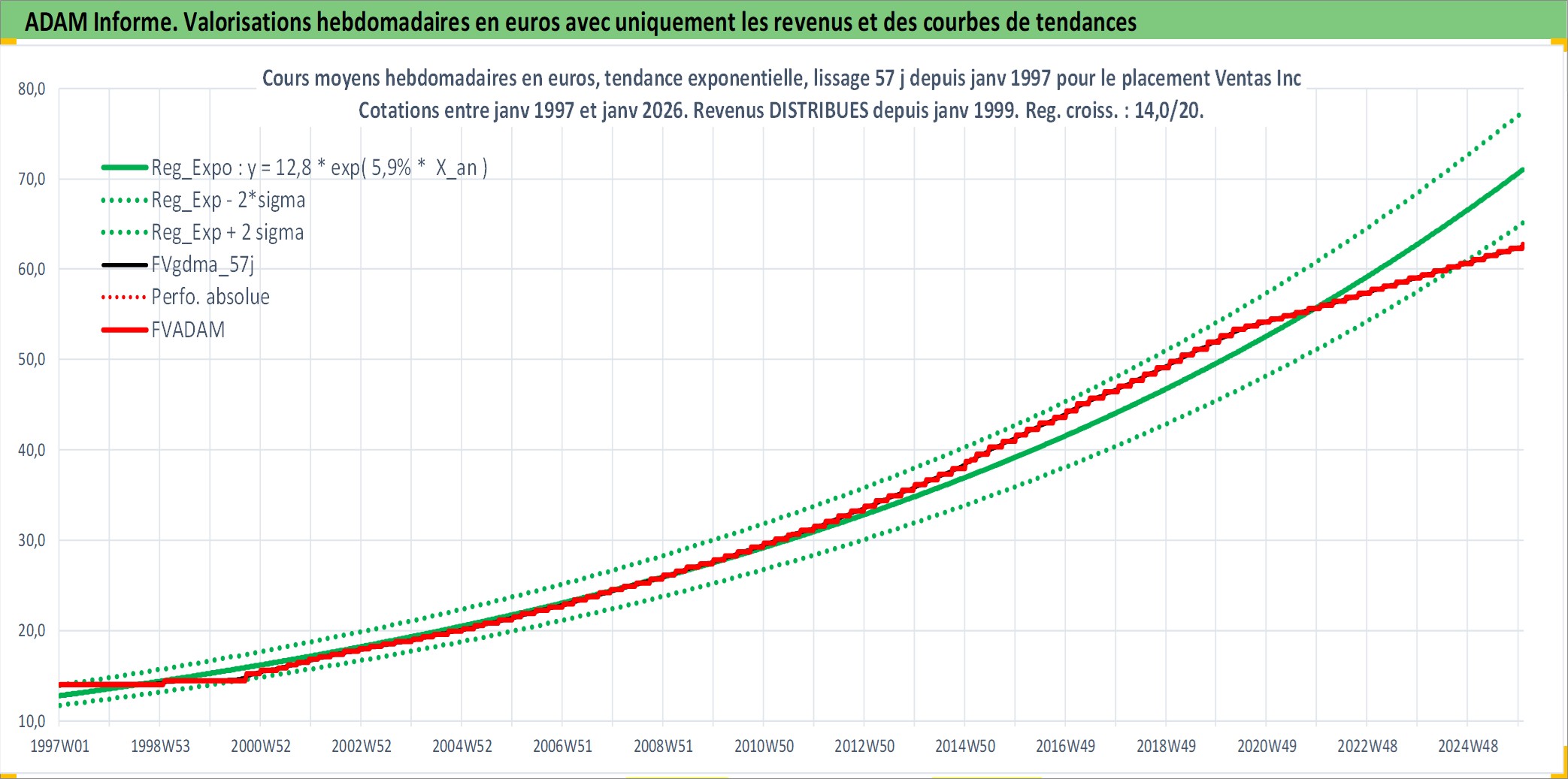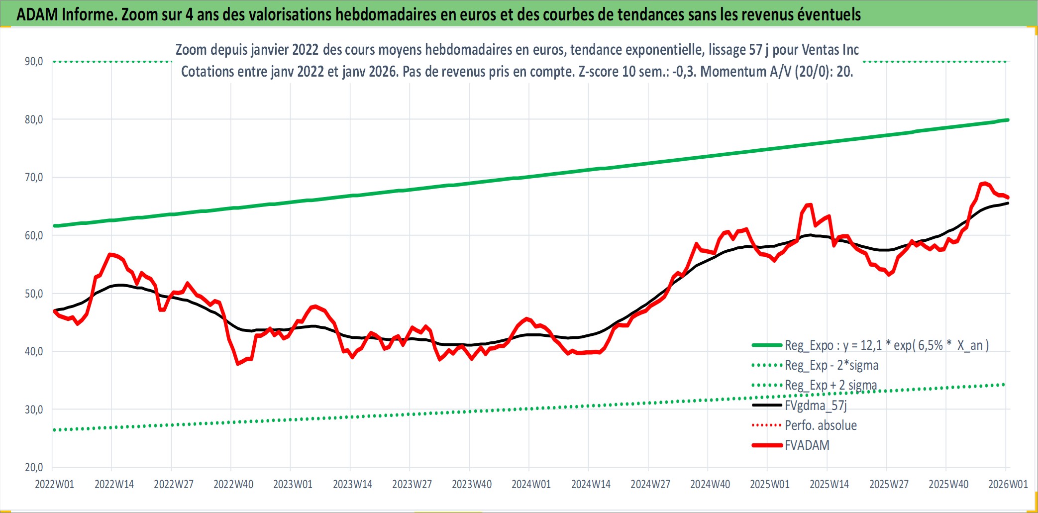 Site dédié aux investisseursPage dédiée sur site financeAnalyse des valorisations hebdomadaires de l'action Ventas Inc. Cet actif est cote en USD. Les valorisations sont en contrevaleur EURO et couvrent les semaines 1997W01 a 2026W01. Les revenus de cet actif financier sont pris en compte depuis la semaine 1999W04. La note globale ESG de cet actif est estimee a 15.0 (apres rebasage entre 0 et 20).