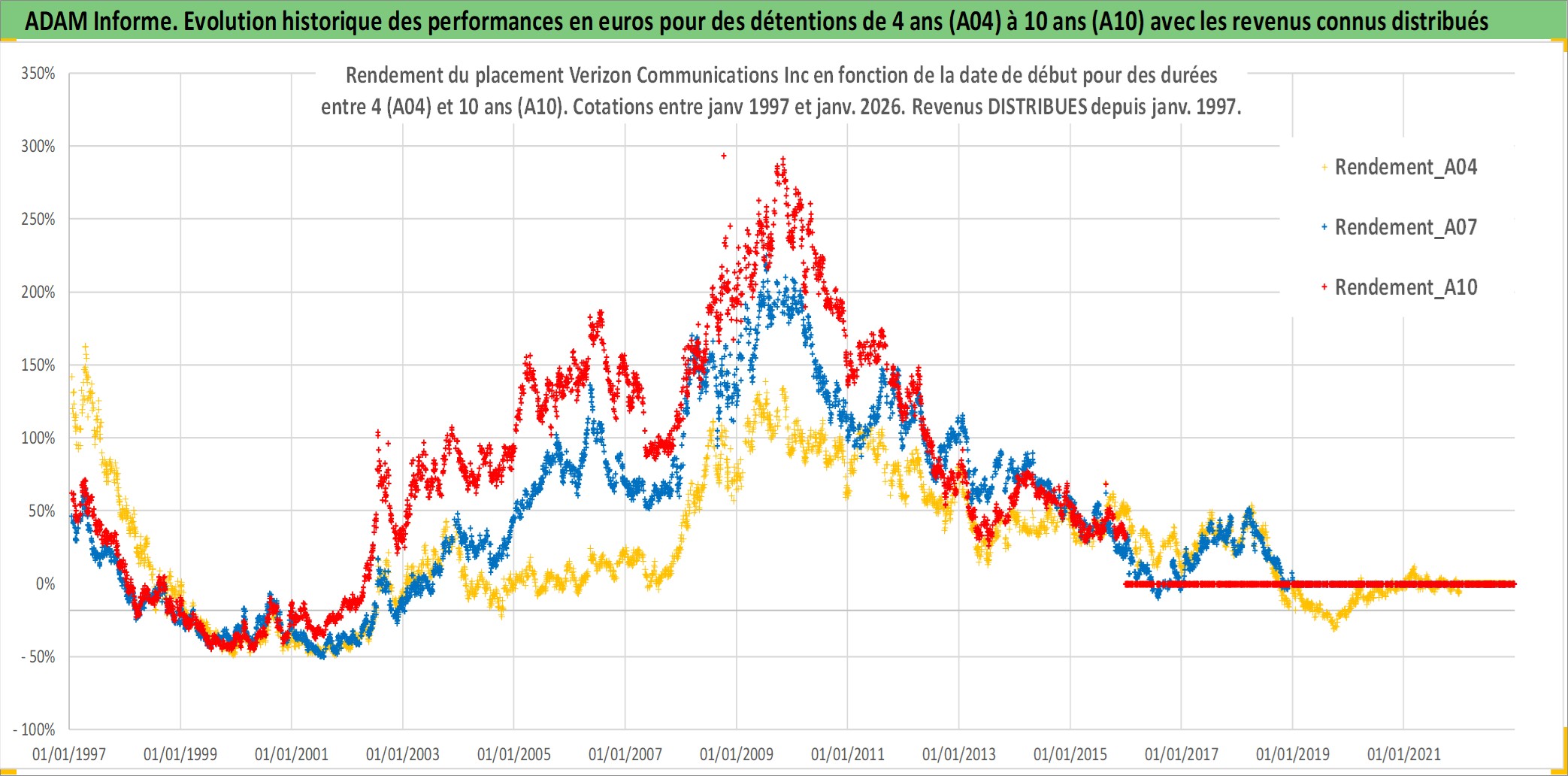 Site dédié aux investisseursPage dédiée sur site financeAnalyse des valorisations hebdomadaires de l'action Verizon Communications Inc. Cet actif est cote en USD. Les valorisations sont en contrevaleur EURO et couvrent les semaines 1997W01 a 2026W01. Les revenus de cet actif financier sont pris en compte depuis la semaine 1997W02. La note globale ESG de cet actif est estimee a 11.0 (apres rebasage entre 0 et 20).