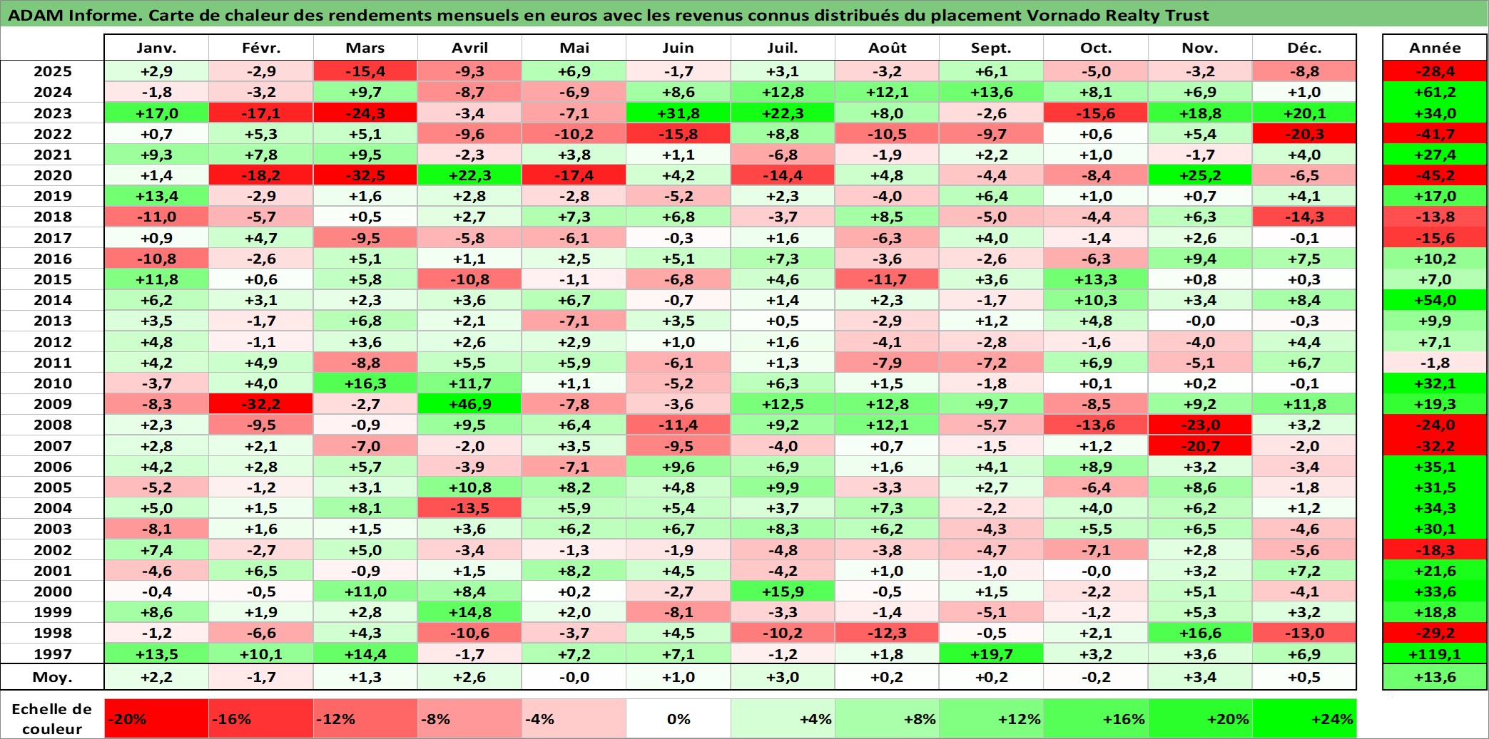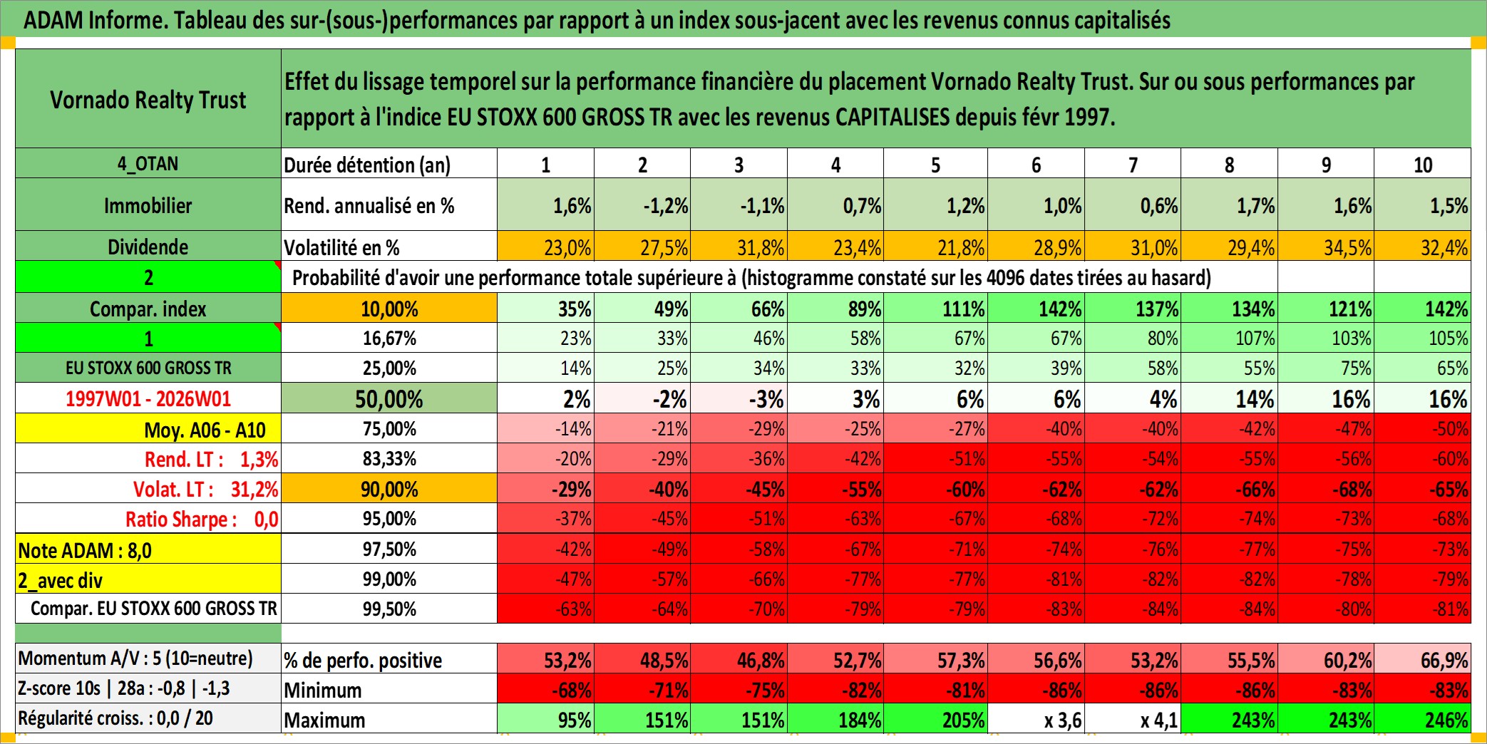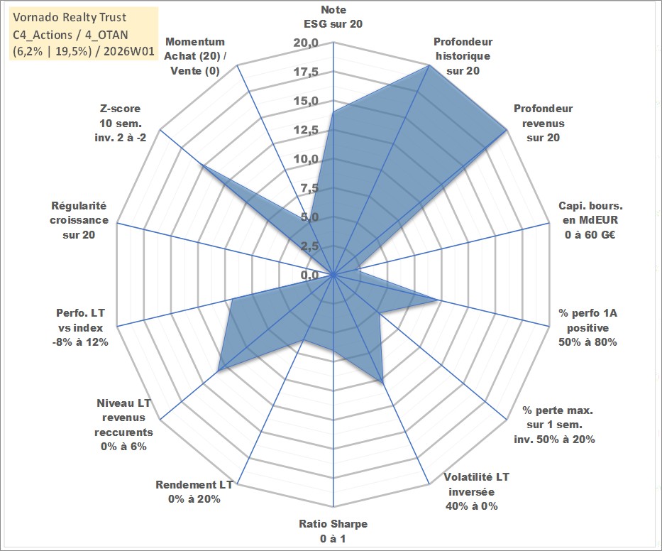 Site dédié aux investisseursPage dédiée sur site financeAnalyse des valorisations hebdomadaires de l'action Vornado Realty Trust. Cet actif est cote en USD. Les valorisations sont en contrevaleur EURO et couvrent les semaines 1997W01 a 2026W01. Les revenus de cet actif financier sont pris en compte depuis la semaine 1997W06. La note globale ESG de cet actif est estimee a 14.0 (apres rebasage entre 0 et 20).