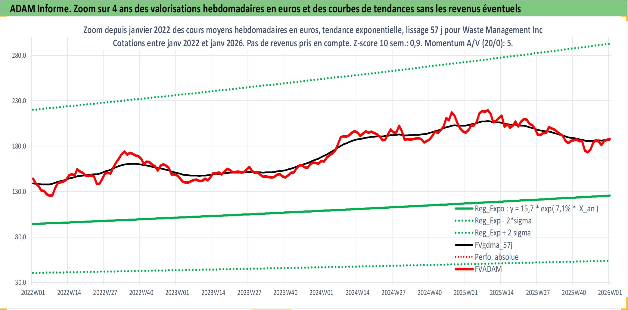 Site dédié aux investisseursPage dédiée sur site financeAnalyse des valorisations hebdomadaires de l'action Waste Management Inc. Cet actif est cote en USD. Les valorisations sont en contrevaleur EURO et couvrent les semaines 1997W01 a 2026W01. Les revenus de cet actif financier sont pris en compte depuis la semaine 1998W40. La note globale ESG de cet actif est estimee a 12.0 (apres rebasage entre 0 et 20).