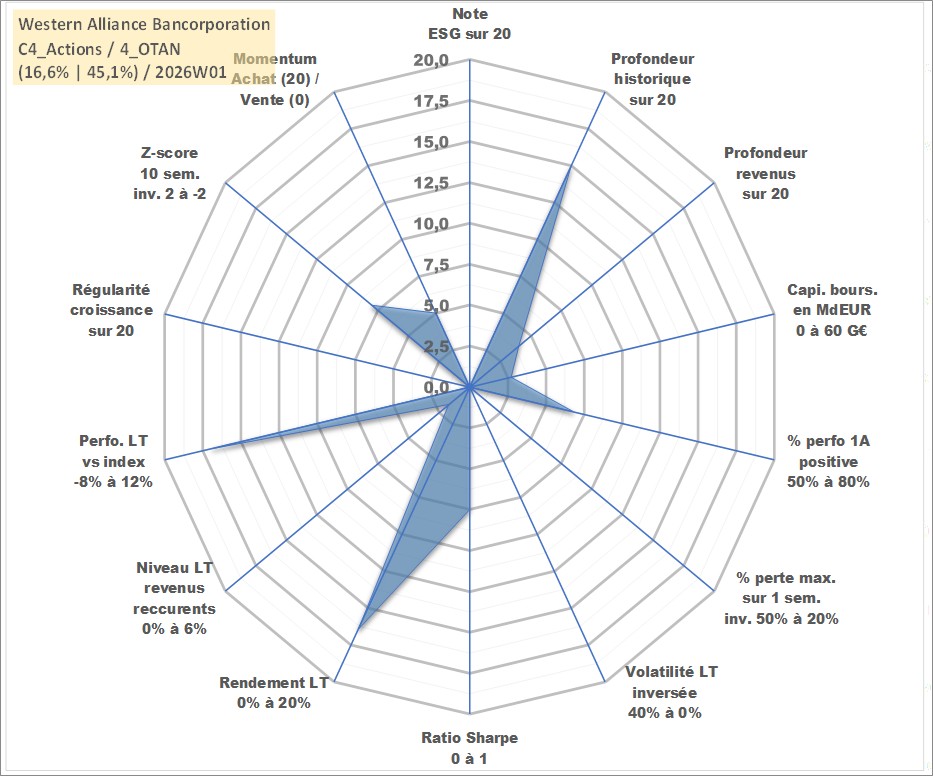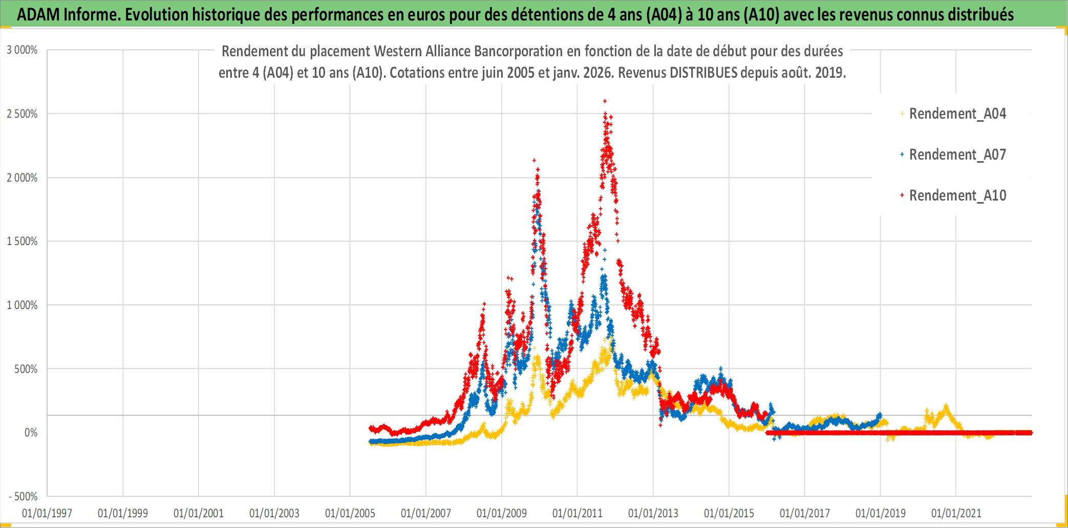 Site dédié aux investisseursPage dédiée sur site financeAnalyse des valorisations hebdomadaires de l'action Western Alliance Bancorporation. Cet actif est cote en USD. Les valorisations sont en contrevaleur EURO et couvrent les semaines 2005W26 a 2026W01. Les revenus de cet actif financier sont pris en compte depuis la semaine 2019W33. La note ESG de cet actif n'est pas connue.