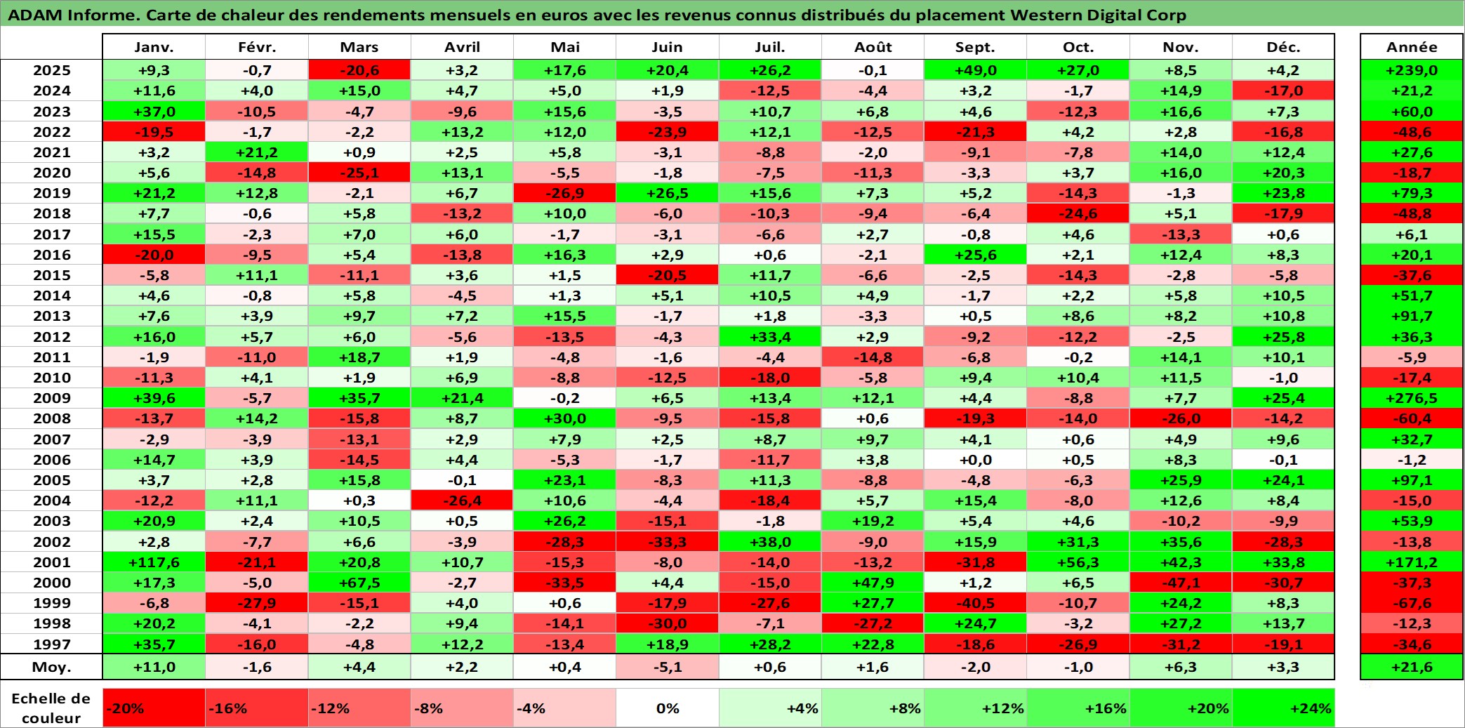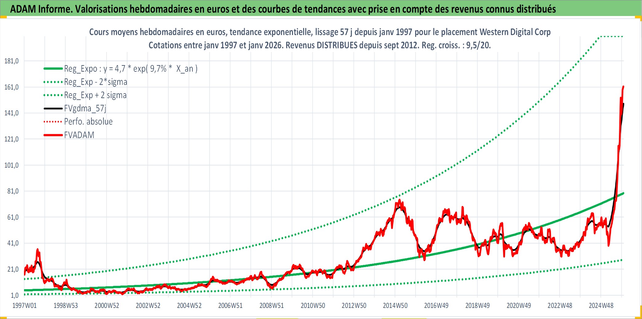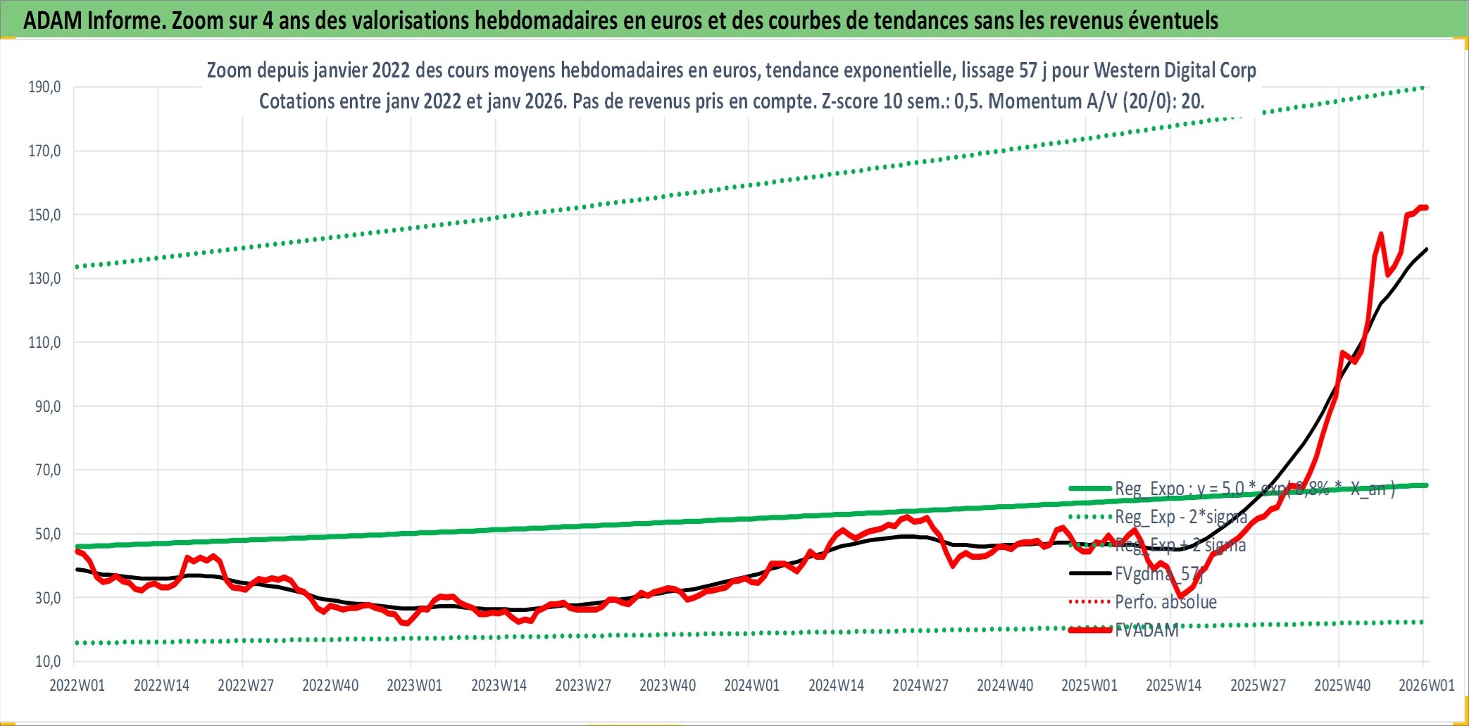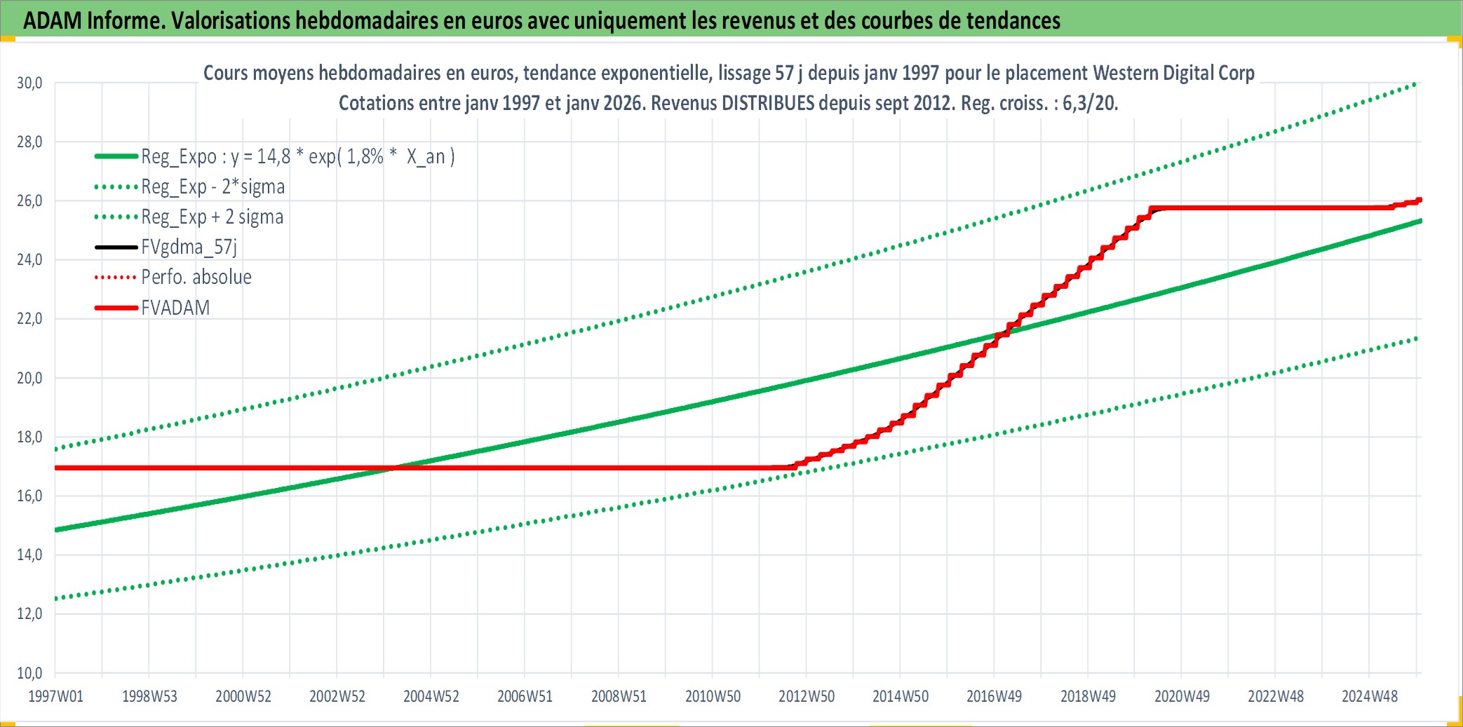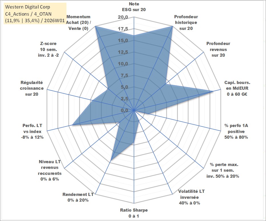 Site dédié aux investisseursPage dédiée sur site financeAnalyse des valorisations hebdomadaires de l'action Western Digital Corp. Cet actif est cote en USD. Les valorisations sont en contrevaleur EURO et couvrent les semaines 1997W01 a 2026W01. Les revenus de cet actif financier sont pris en compte depuis la semaine 2012W39. La note globale ESG de cet actif est estimee a 16.0 (apres rebasage entre 0 et 20).