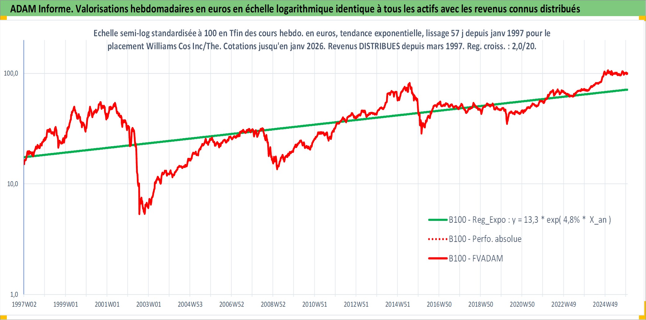 Site dédié aux investisseursPage dédiée sur site financeAnalyse des valorisations hebdomadaires de l'action Williams Cos Inc/The. Cet actif est cote en USD. Les valorisations sont en contrevaleur EURO et couvrent les semaines 1997W01 a 2026W01. Les revenus de cet actif financier sont pris en compte depuis la semaine 1997W10. La note globale ESG de cet actif est estimee a 8.0 (apres rebasage entre 0 et 20).