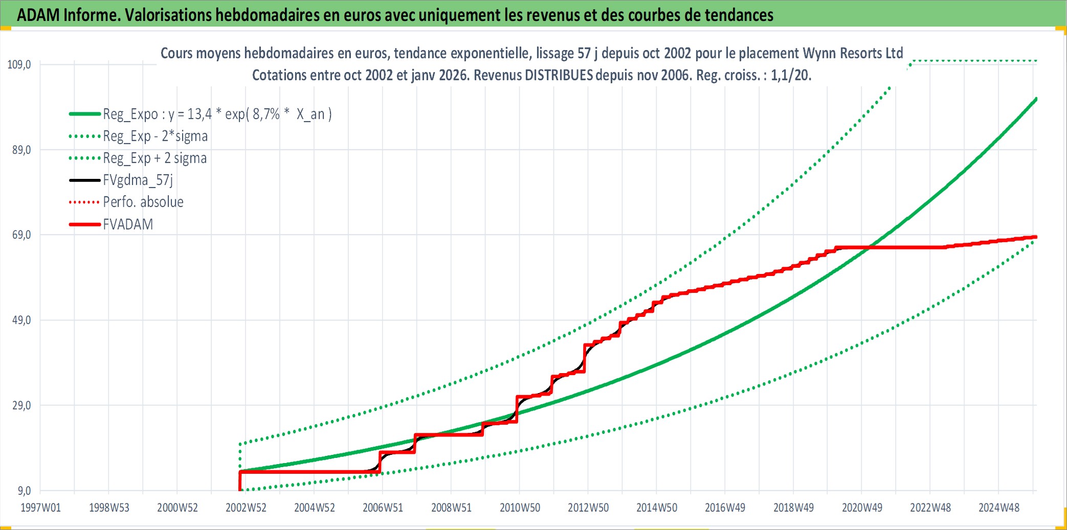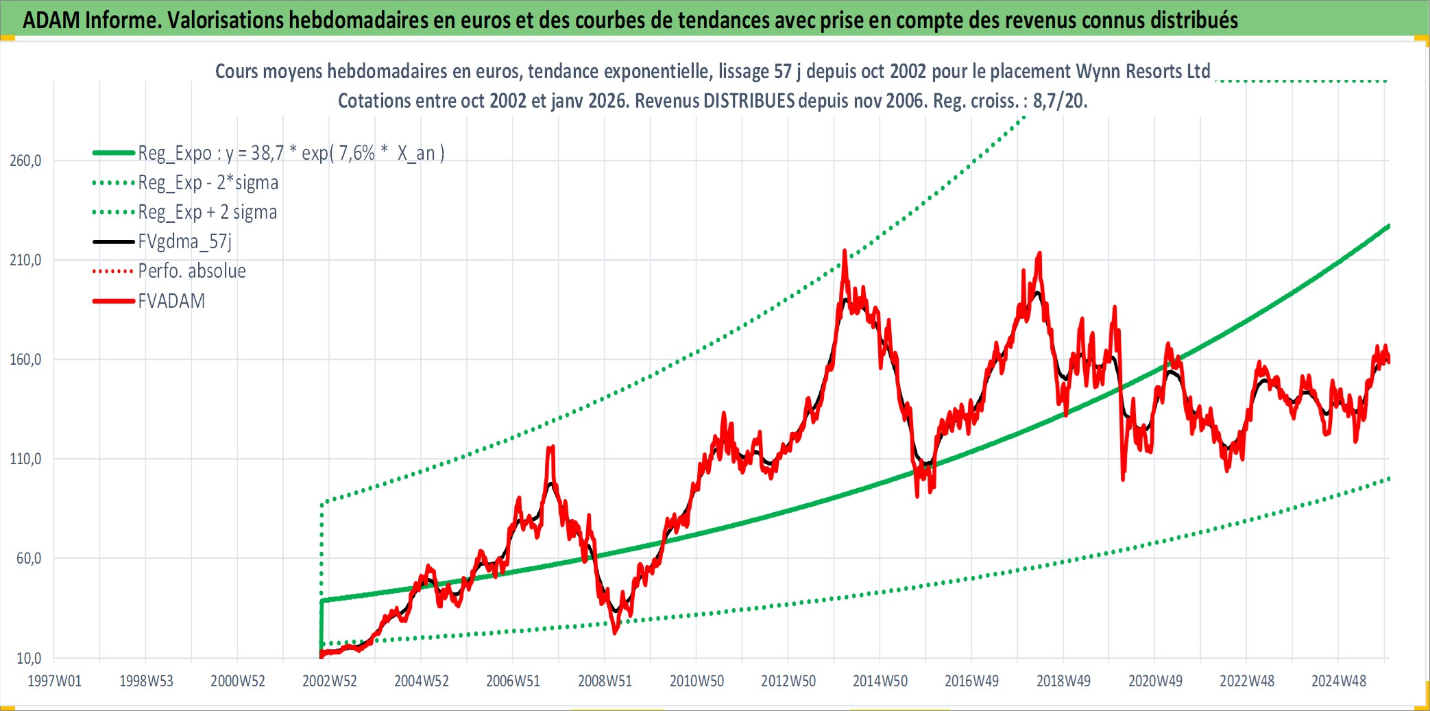 Site dédié aux investisseursPage dédiée sur site financeAnalyse des valorisations hebdomadaires de l'action Wynn Resorts Ltd. Cet actif est cote en USD. Les valorisations sont en contrevaleur EURO et couvrent les semaines 2002W43 a 2026W01. Les revenus de cet actif financier sont pris en compte depuis la semaine 2006W47. La note globale ESG de cet actif est estimee a 7.0 (apres rebasage entre 0 et 20).