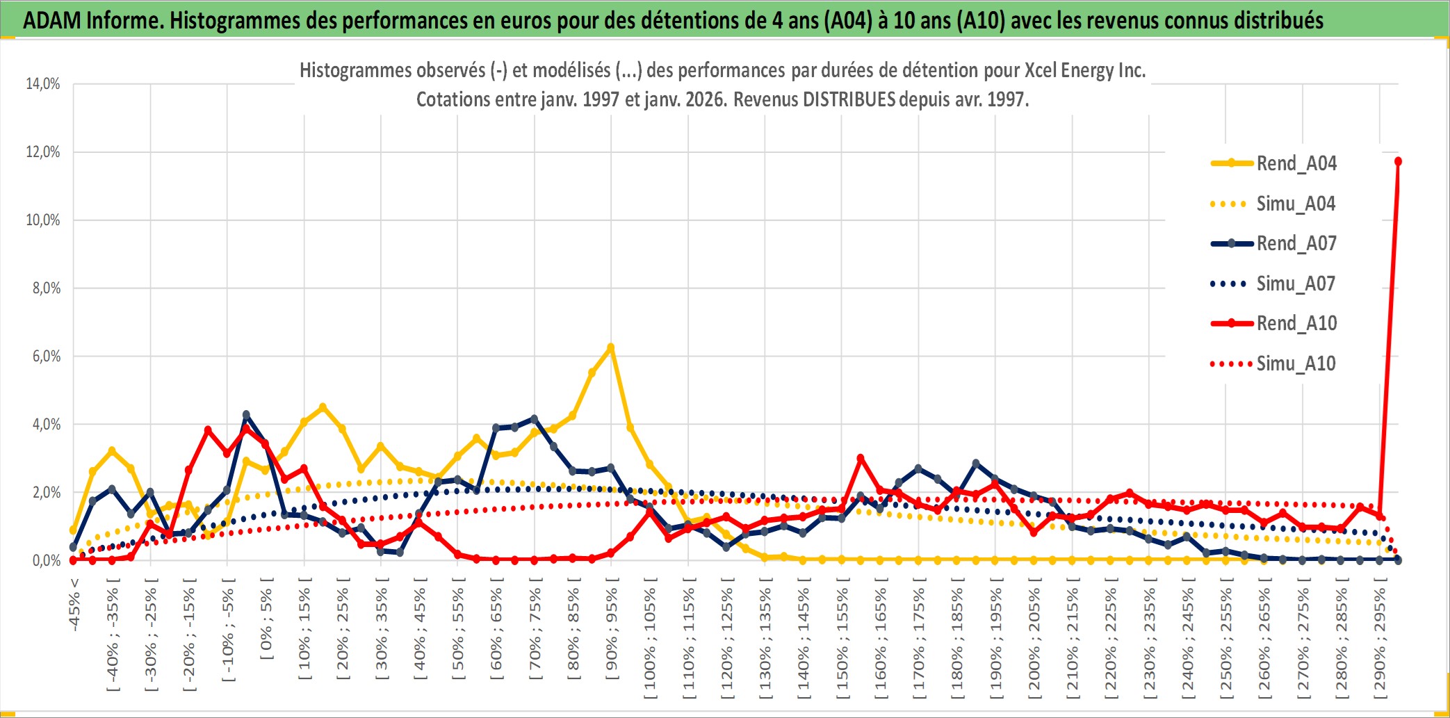 Site dédié aux investisseursPage dédiée sur site financeAnalyse des valorisations hebdomadaires de l'action Xcel Energy Inc. Cet actif est cote en USD. Les valorisations sont en contrevaleur EURO et couvrent les semaines 1997W01 a 2026W01. Les revenus de cet actif financier sont pris en compte depuis la semaine 1997W15. La note globale ESG de cet actif est estimee a 8.0 (apres rebasage entre 0 et 20).