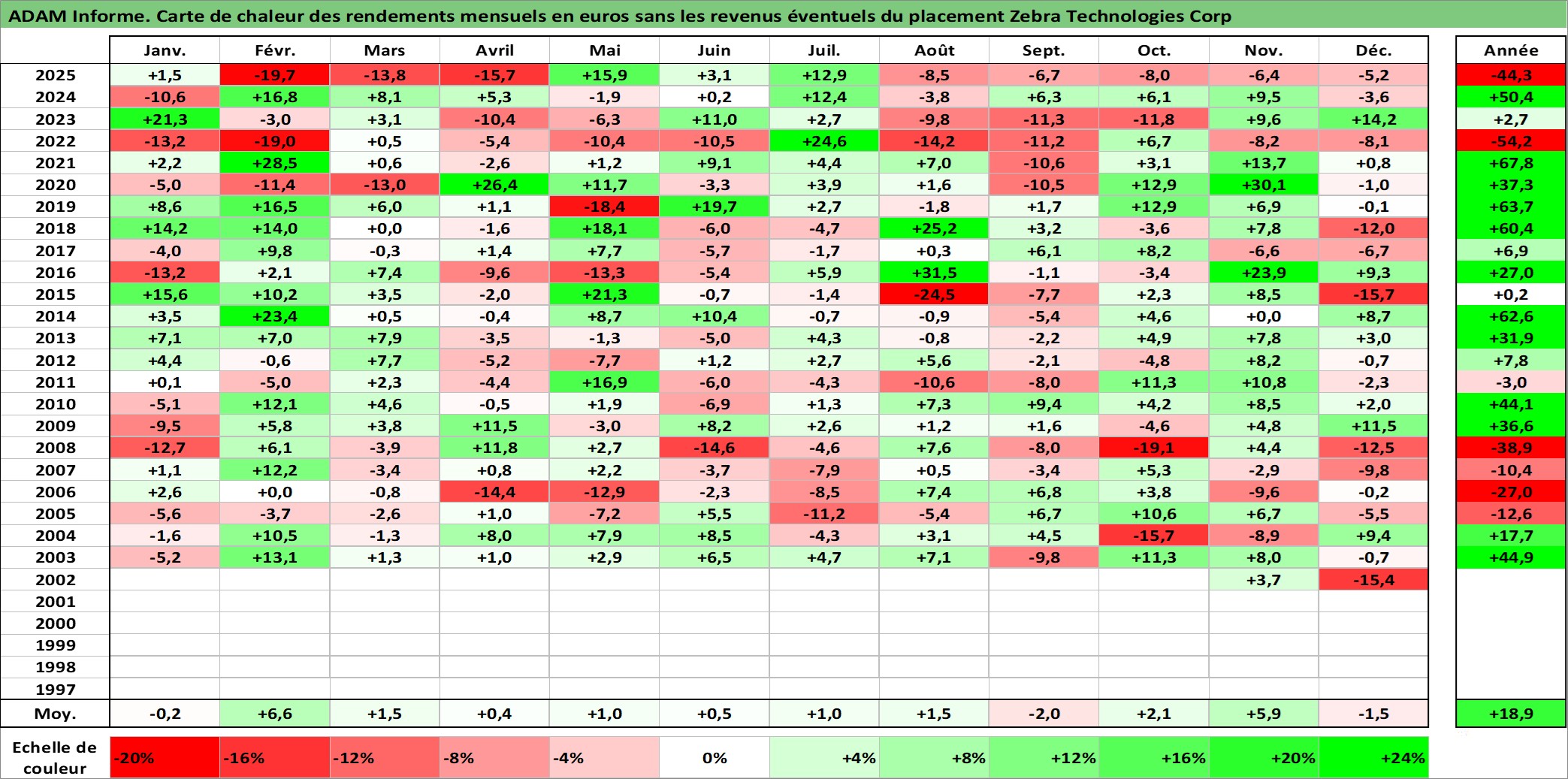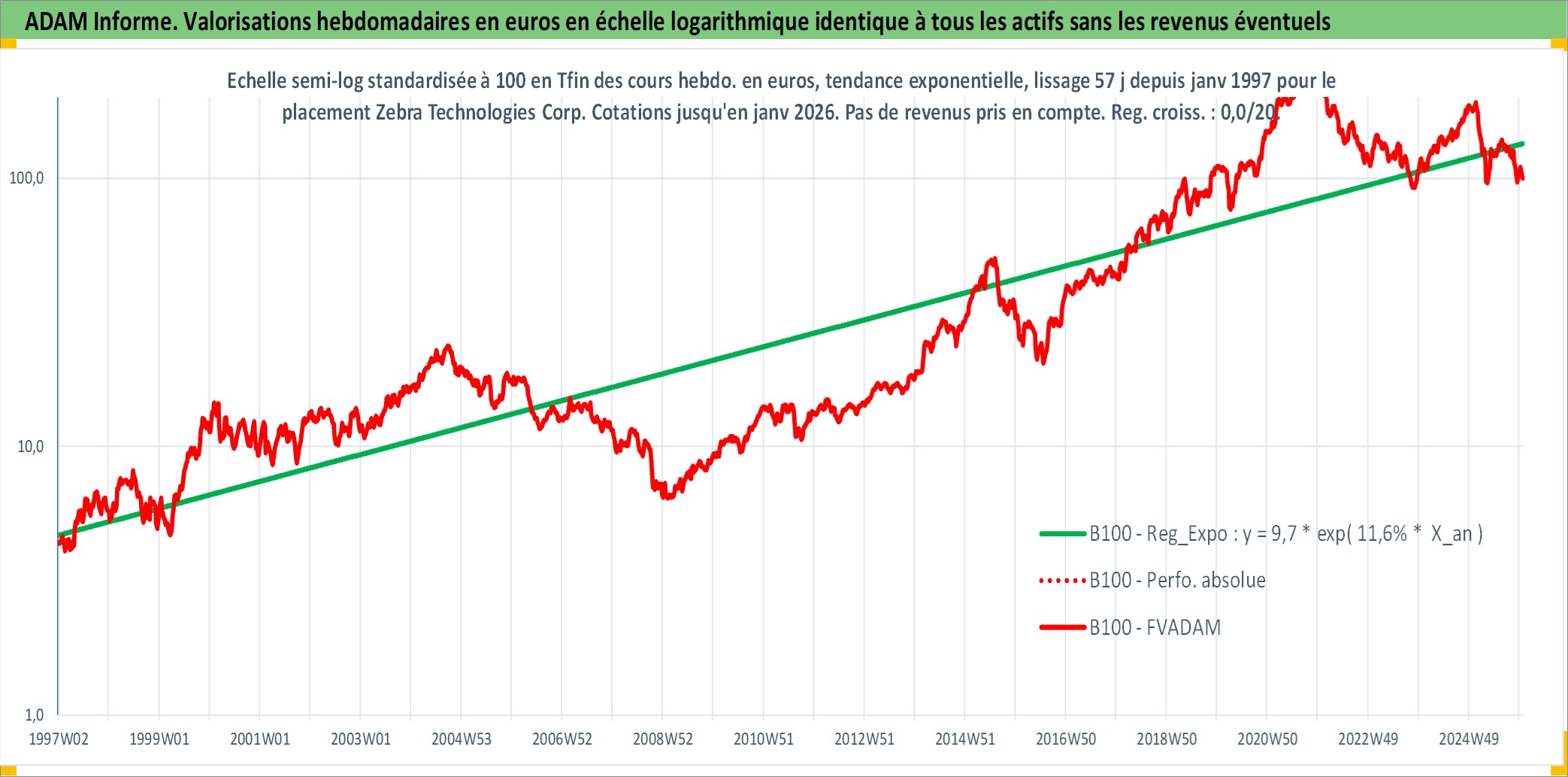 Site dédié aux investisseursPage dédiée sur site financeAnalyse des valorisations hebdomadaires de l'action Zebra Technologies Corp. Cet actif est cote en USD. Les valorisations sont en contrevaleur EURO et couvrent les semaines 1997W01 a 2026W01. Les revenus de cet actif financier ne sont pas connus car non existants ou non disponibles sur le site Yahoo Finance. La note ESG de cet actif n'est pas connue.