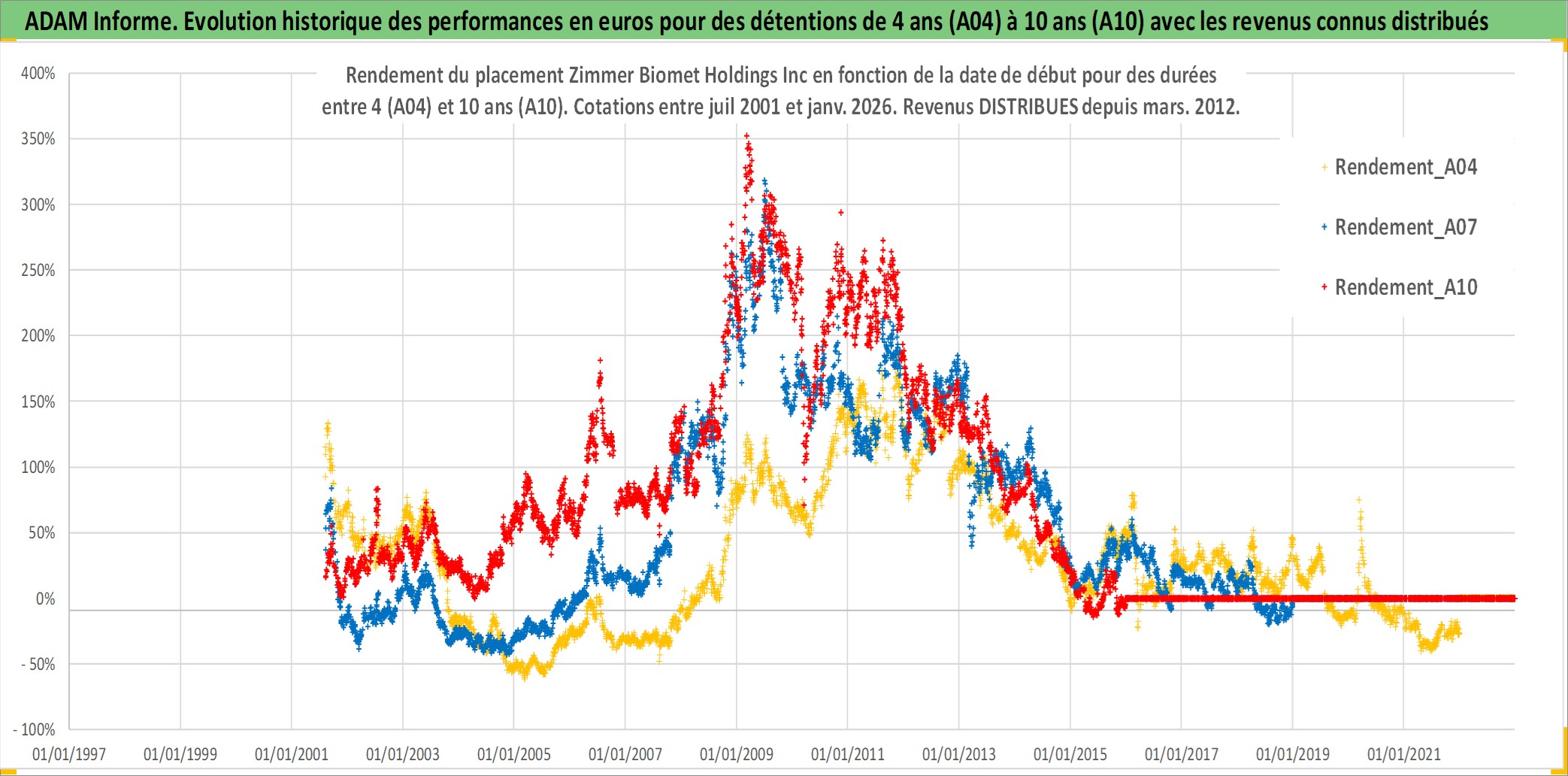 Site dédié aux investisseursPage dédiée sur site financeAnalyse des valorisations hebdomadaires de l'action Zimmer Biomet Holdings Inc. Cet actif est cote en USD. Les valorisations sont en contrevaleur EURO et couvrent les semaines 2001W30 a 2026W01. Les revenus de cet actif financier sont pris en compte depuis la semaine 2012W13. La note globale ESG de cet actif est estimee a 7.0 (apres rebasage entre 0 et 20).
