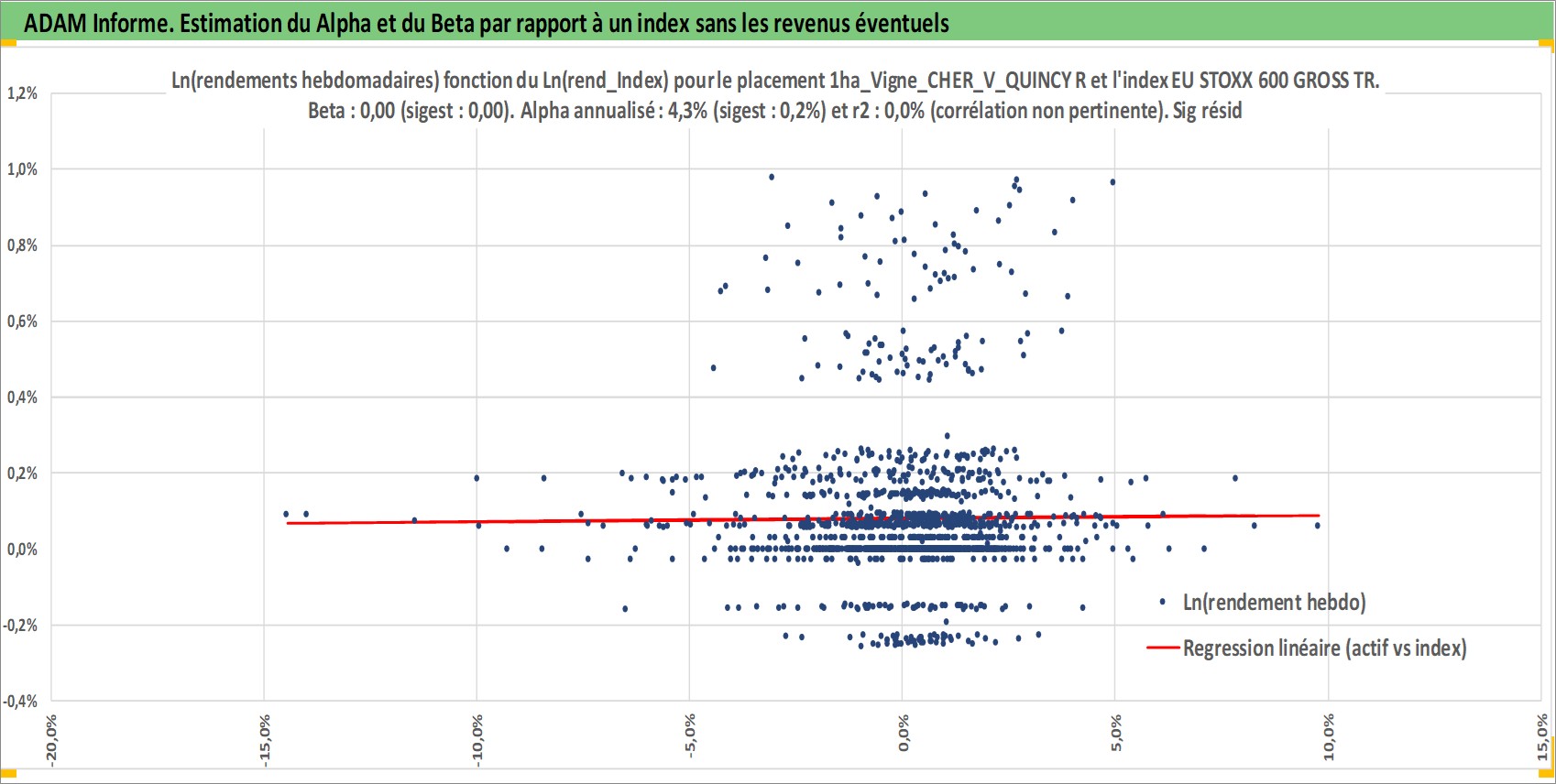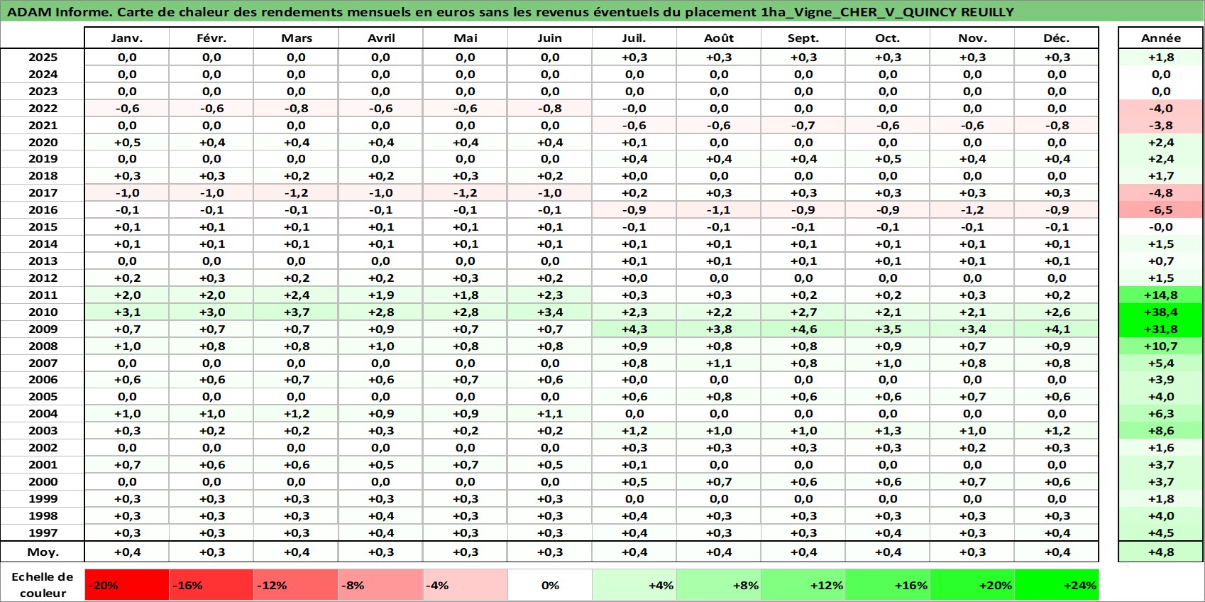 Site dédié aux investisseursPage dédiée sur site financeAnalyse des valorisations hebdomadaires de l'actif 1ha_Vigne_CHER_V_QUINCY REUILLY. Cet actif est cote en EUR. Les valorisations couvrent les semaines 1997W01 a 2026W01. Les fermages de ce bien foncier sont pris egaux a 2,5% annuels de la valeur venale du bien.