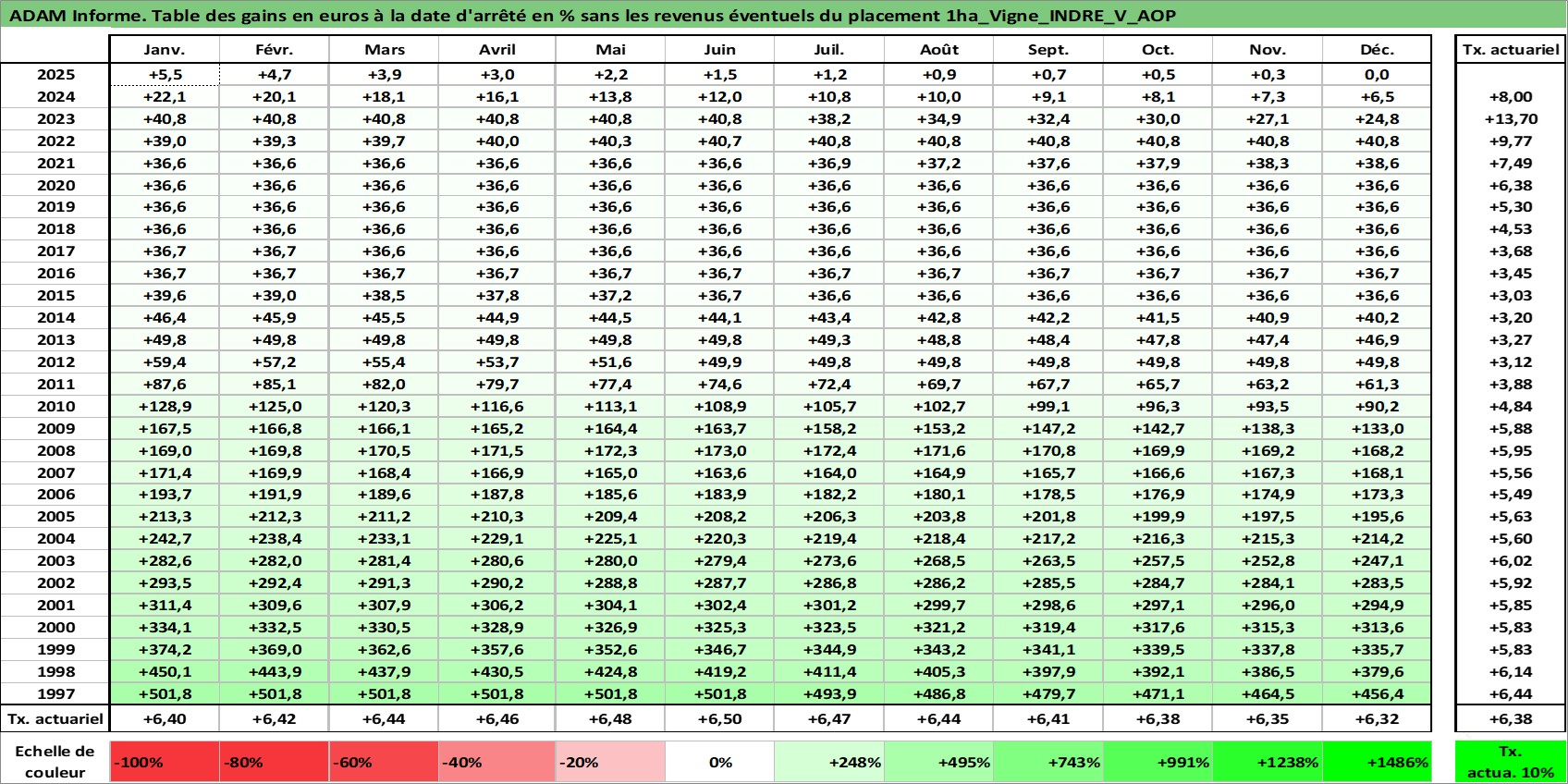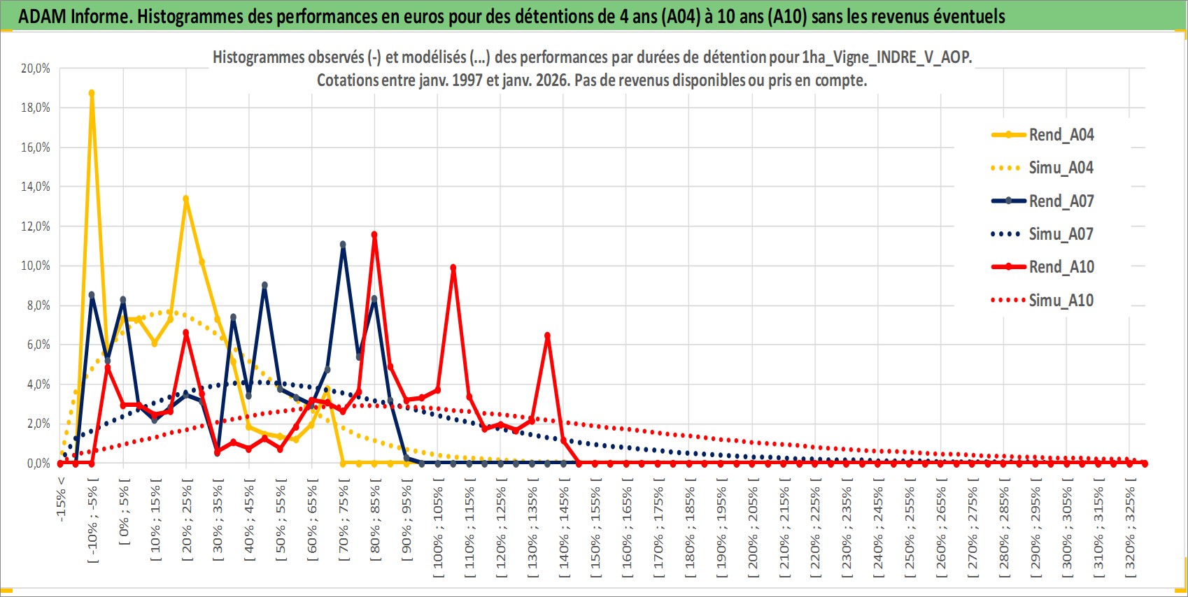 Site dédié aux investisseursPage dédiée sur site financeAnalyse des valorisations hebdomadaires de l'actif 1ha_Vigne_INDRE_V_AOP. Cet actif est cote en EUR. Les valorisations couvrent les semaines 1997W01 a 2026W01. Les fermages de ce bien foncier sont pris egaux a 2,5% annuels de la valeur venale du bien.