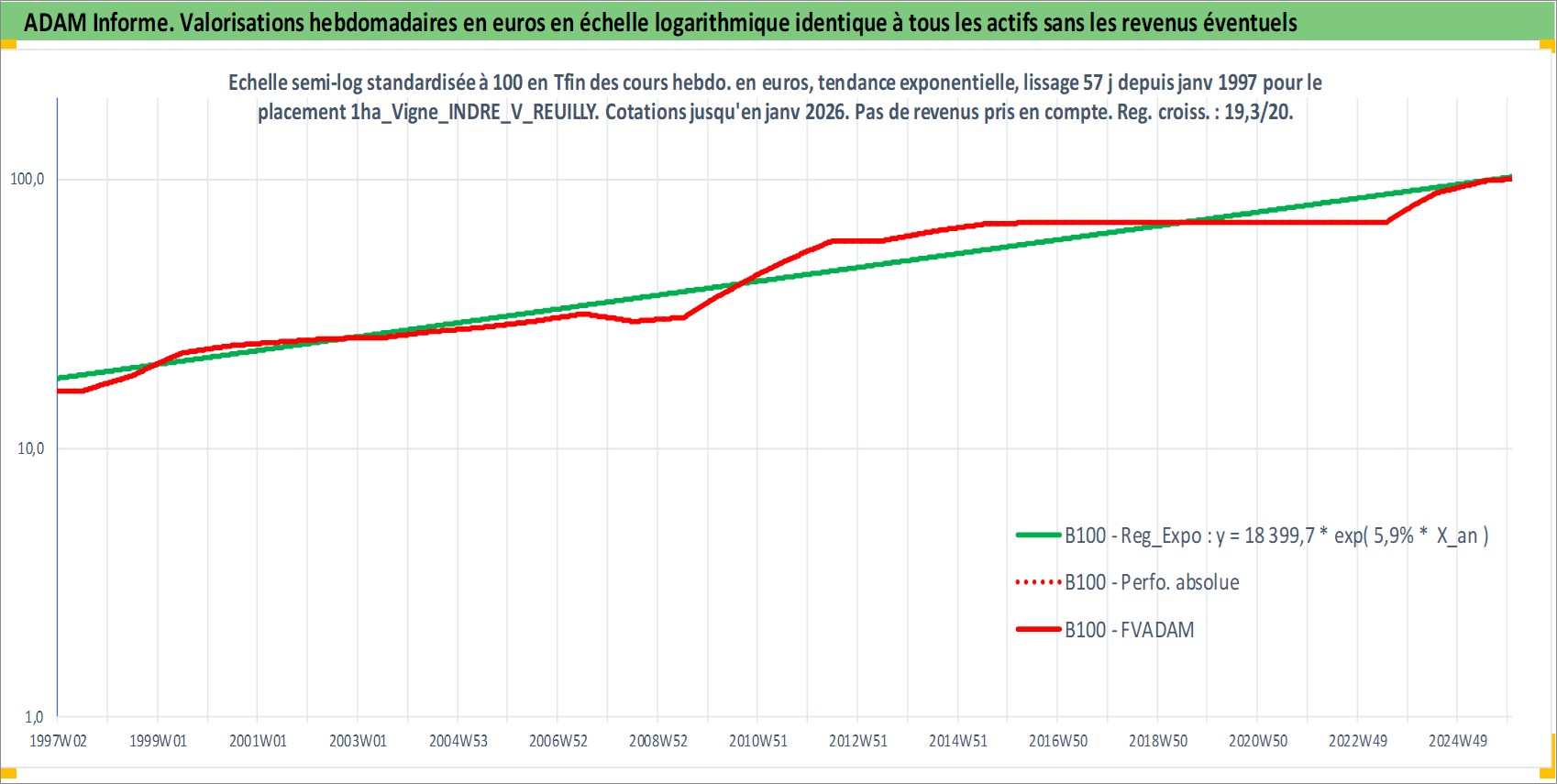 Site dédié aux investisseursPage dédiée sur site financeAnalyse des valorisations hebdomadaires de l'actif 1ha_Vigne_INDRE_V_REUILLY. Cet actif est cote en EUR. Les valorisations couvrent les semaines 1997W01 a 2026W01. Les fermages de ce bien foncier sont pris egaux a 2,5% annuels de la valeur venale du bien.