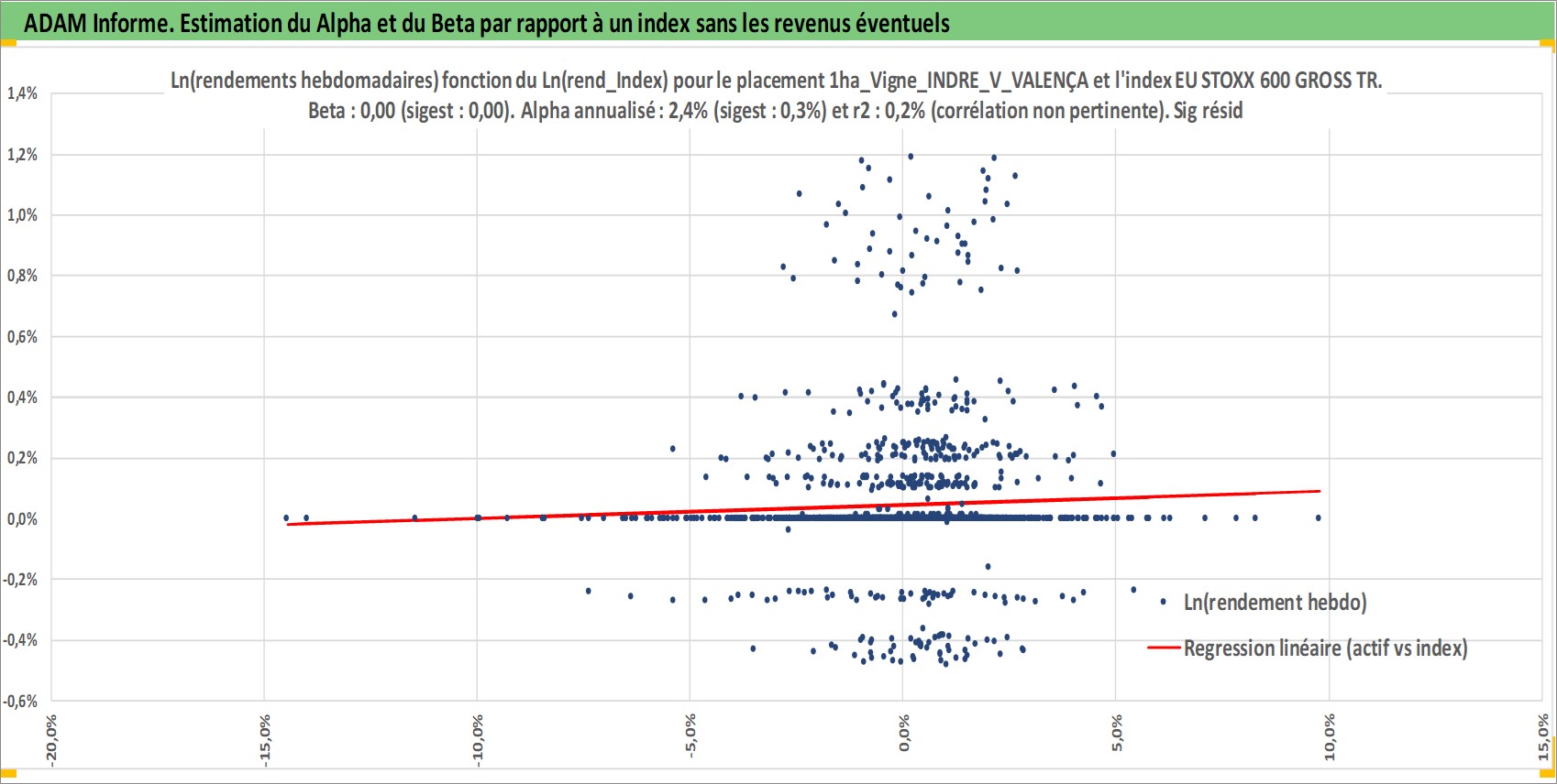 Site dédié aux investisseursPage dédiée sur site financeAnalyse des valorisations hebdomadaires de l'actif 1ha_Vigne_INDRE_V_VALENÇAY. Cet actif est cote en EUR. Les valorisations couvrent les semaines 1997W01 a 2026W01. Les fermages de ce bien foncier sont pris egaux a 2,5% annuels de la valeur venale du bien.