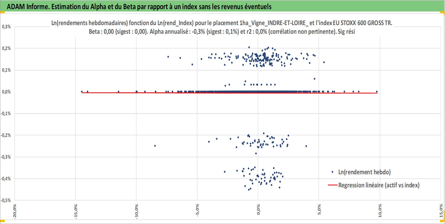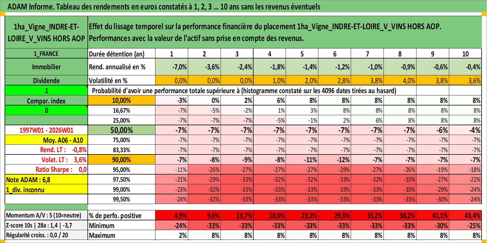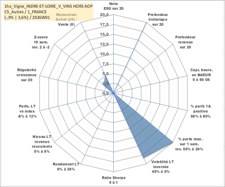 Site dédié aux investisseursPage dédiée sur site financeAnalyse des valorisations hebdomadaires de l'actif 1ha_Vigne_INDRE-ET-LOIRE_V_VINS HORS AOP. Cet actif est cote en EUR. Les valorisations couvrent les semaines 1997W01 a 2026W01. Les fermages de ce bien foncier sont pris egaux a 2,5% annuels de la valeur venale du bien.