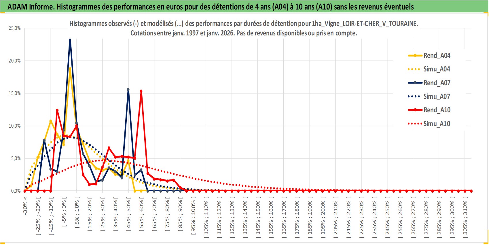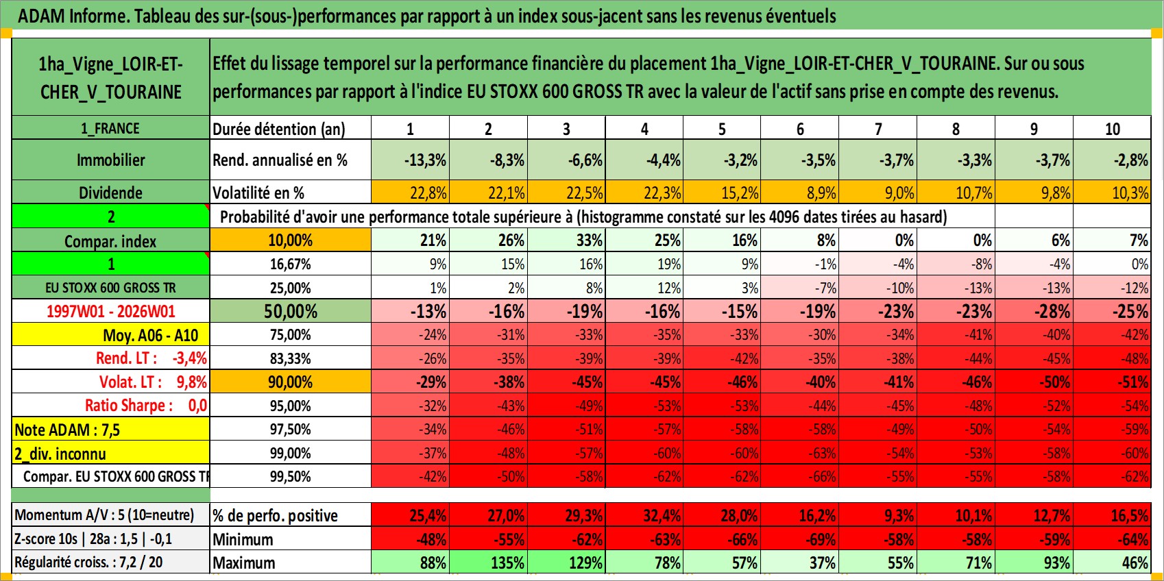 Site dédié aux investisseursPage dédiée sur site financeAnalyse des valorisations hebdomadaires de l'actif 1ha_Vigne_LOIR-ET-CHER_V_TOURAINE. Cet actif est cote en EUR. Les valorisations couvrent les semaines 1997W01 a 2026W01. Les fermages de ce bien foncier sont pris egaux a 2,5% annuels de la valeur venale du bien.