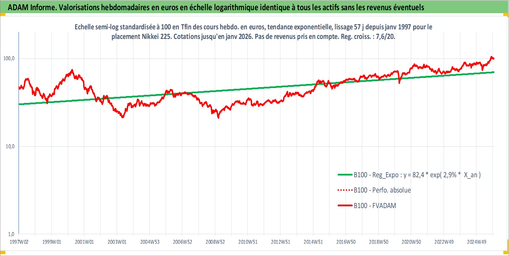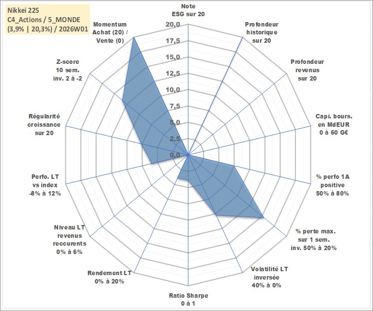 Site dédié aux investisseursPage dédiée sur site financeAnalyse des valorisations hebdomadaires de l'actif Nikkei 225. Cet actif est cote en JPY. Les valorisations sont en contrevaleur EURO et couvrent les semaines 1997W01 a 2026W01. Les revenus de cet actif financier ne sont pas connus car non existants ou non disponibles sur le site Yahoo Finance. La note ESG de cet actif n'est pas connue.