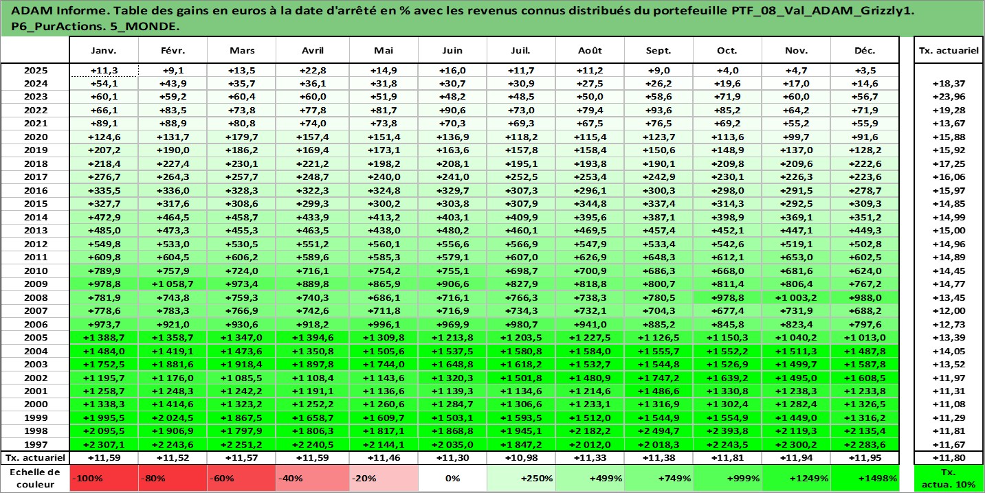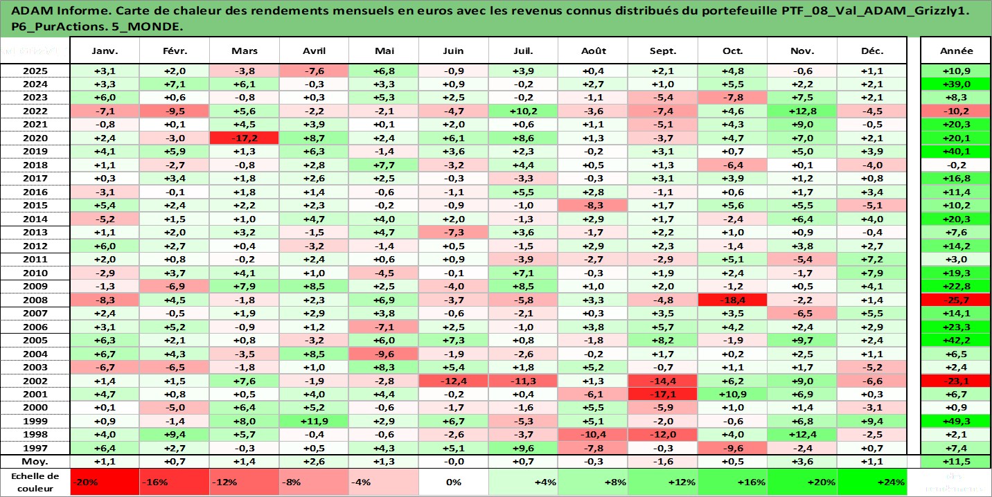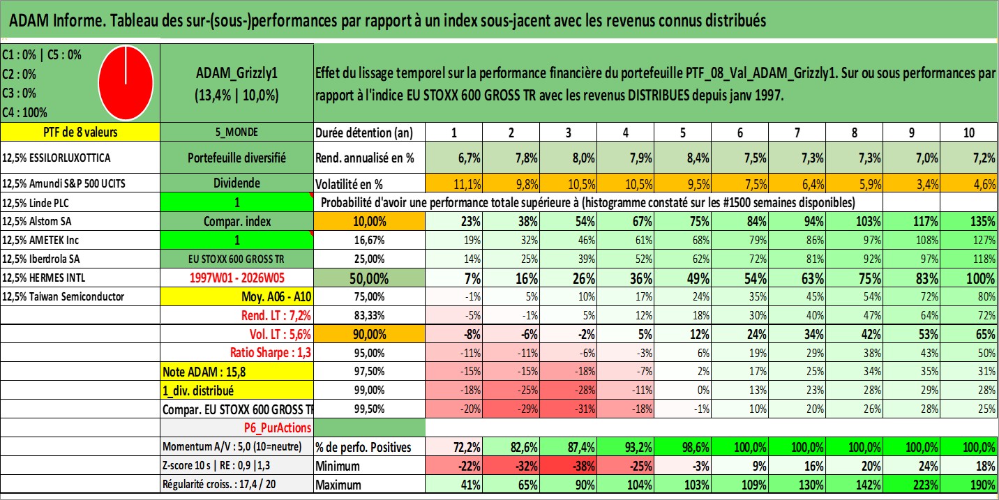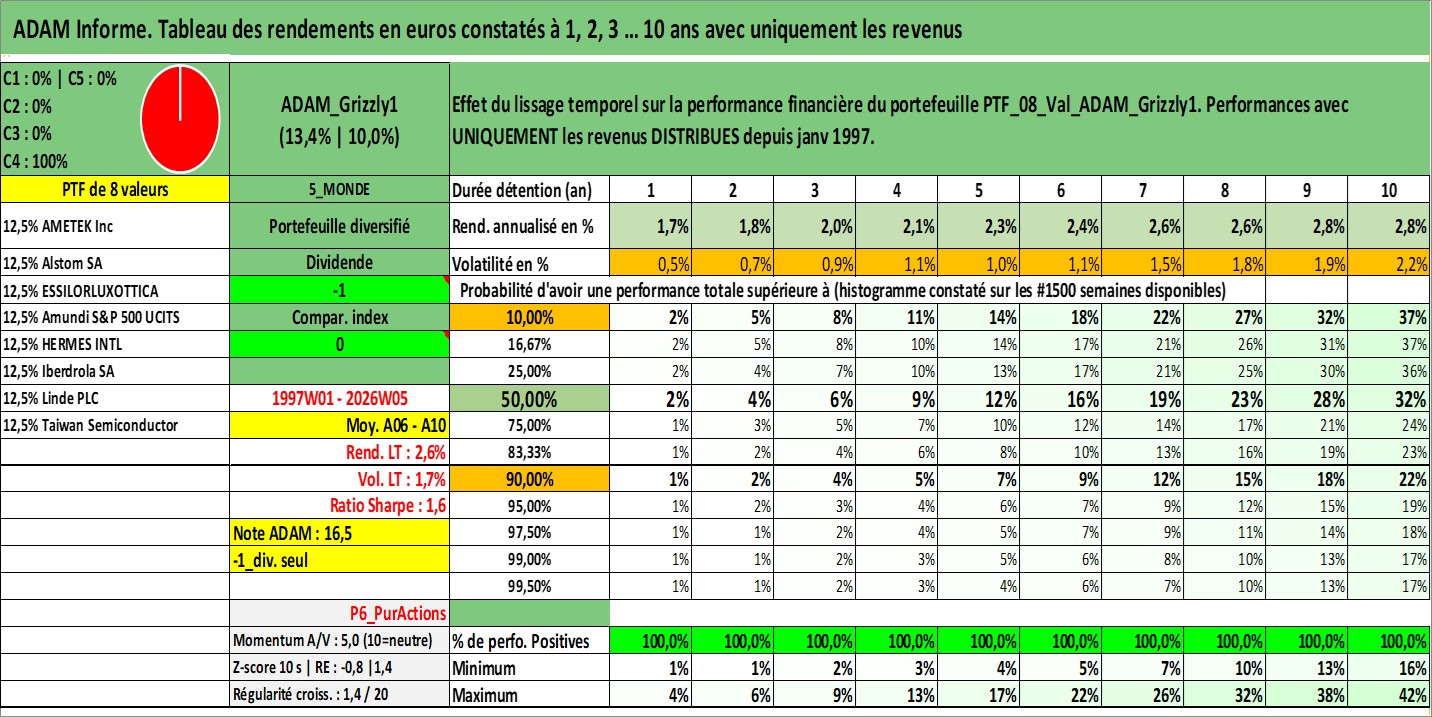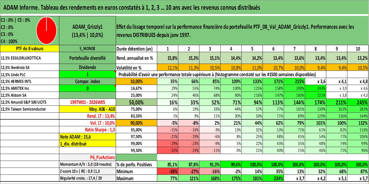 Site dédié aux investisseursPage dédiée sur site financeAnalyse des valorisations hebdomadaires du portefeuille ADAM_Grizzly1_8actifs avec un profil P6_PurActions. Ce portefeuille est cote en EUR. Les valorisations couvrent les semaines 1997W01 a 2026W05. Les revenus de cet actif financier sont pris en compte depuis la semaine 1997W01. La note globale ESG de cet actif est estimee a 11.2 (apres rebasage entre 0 et 20).