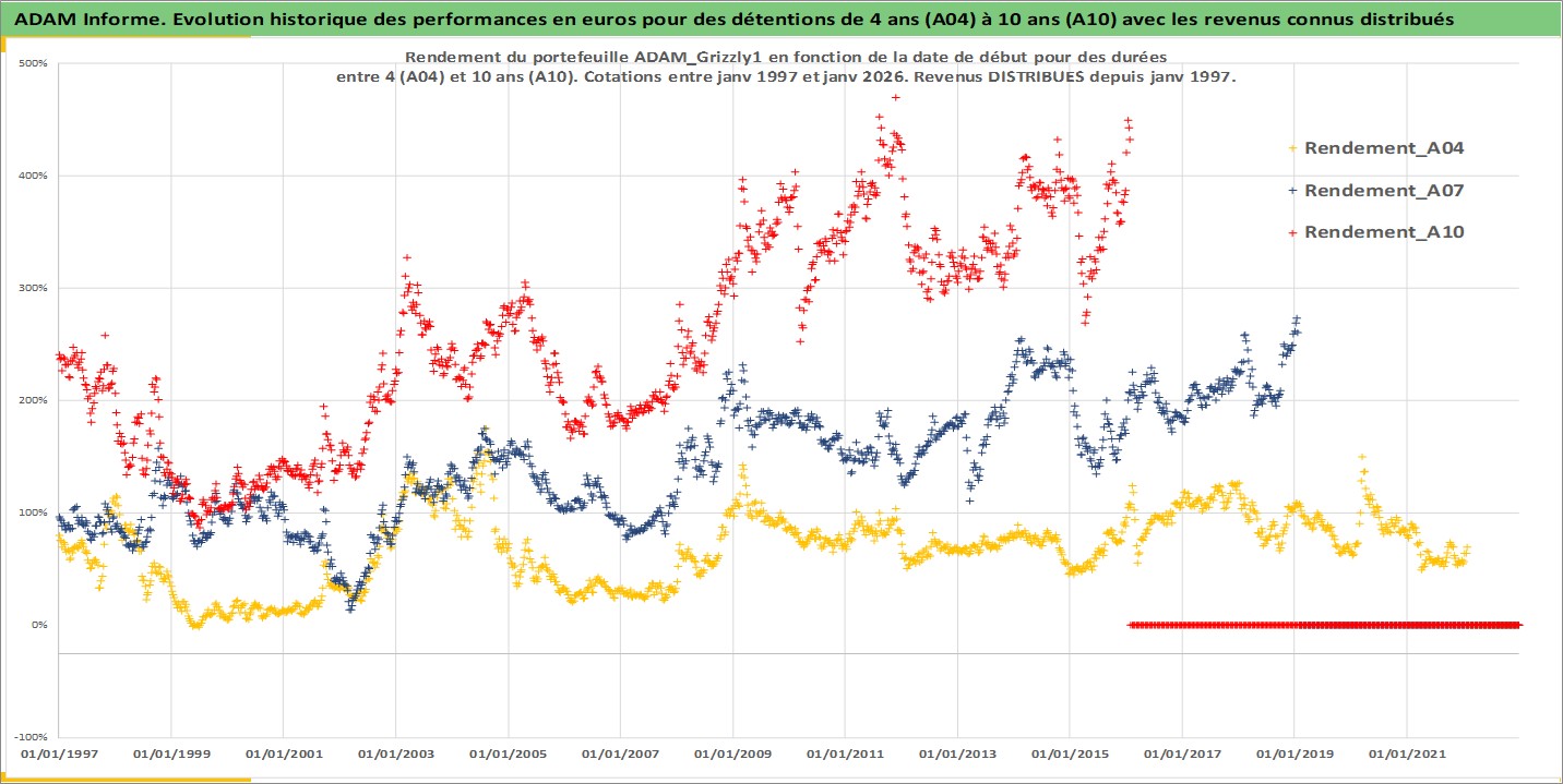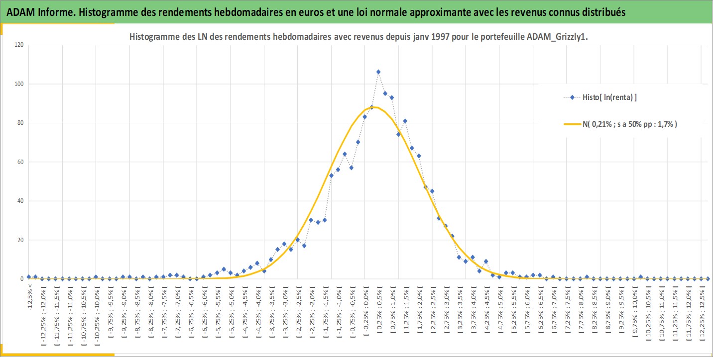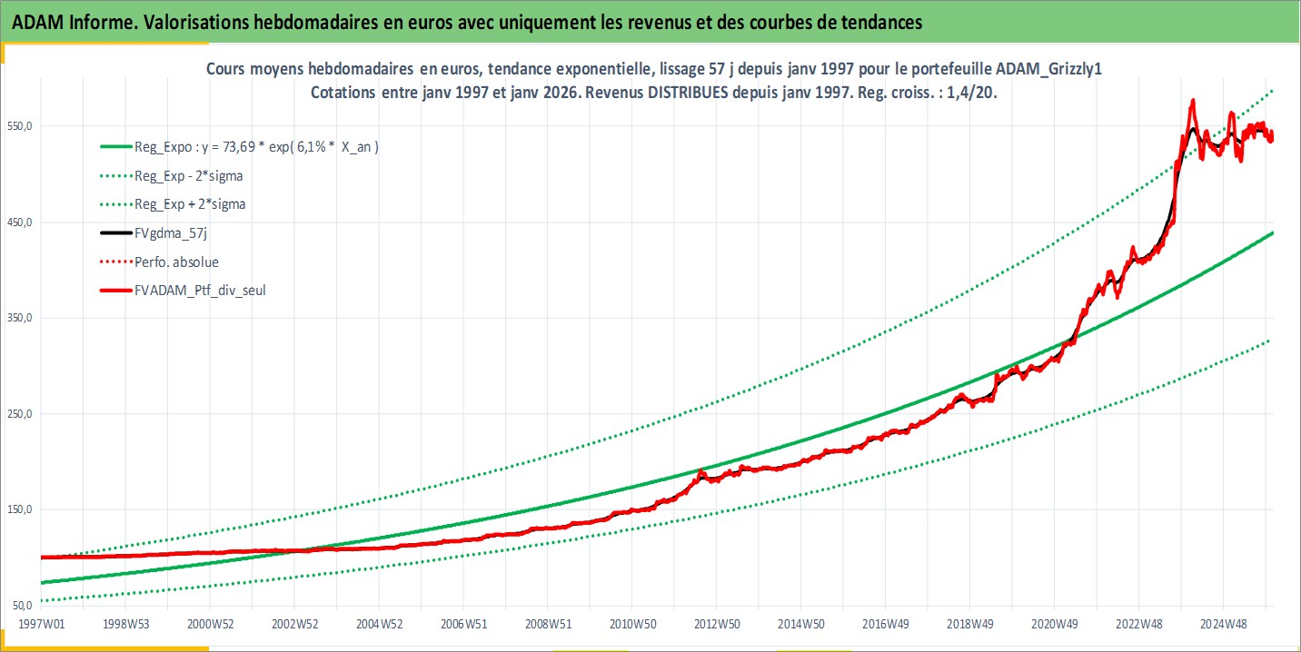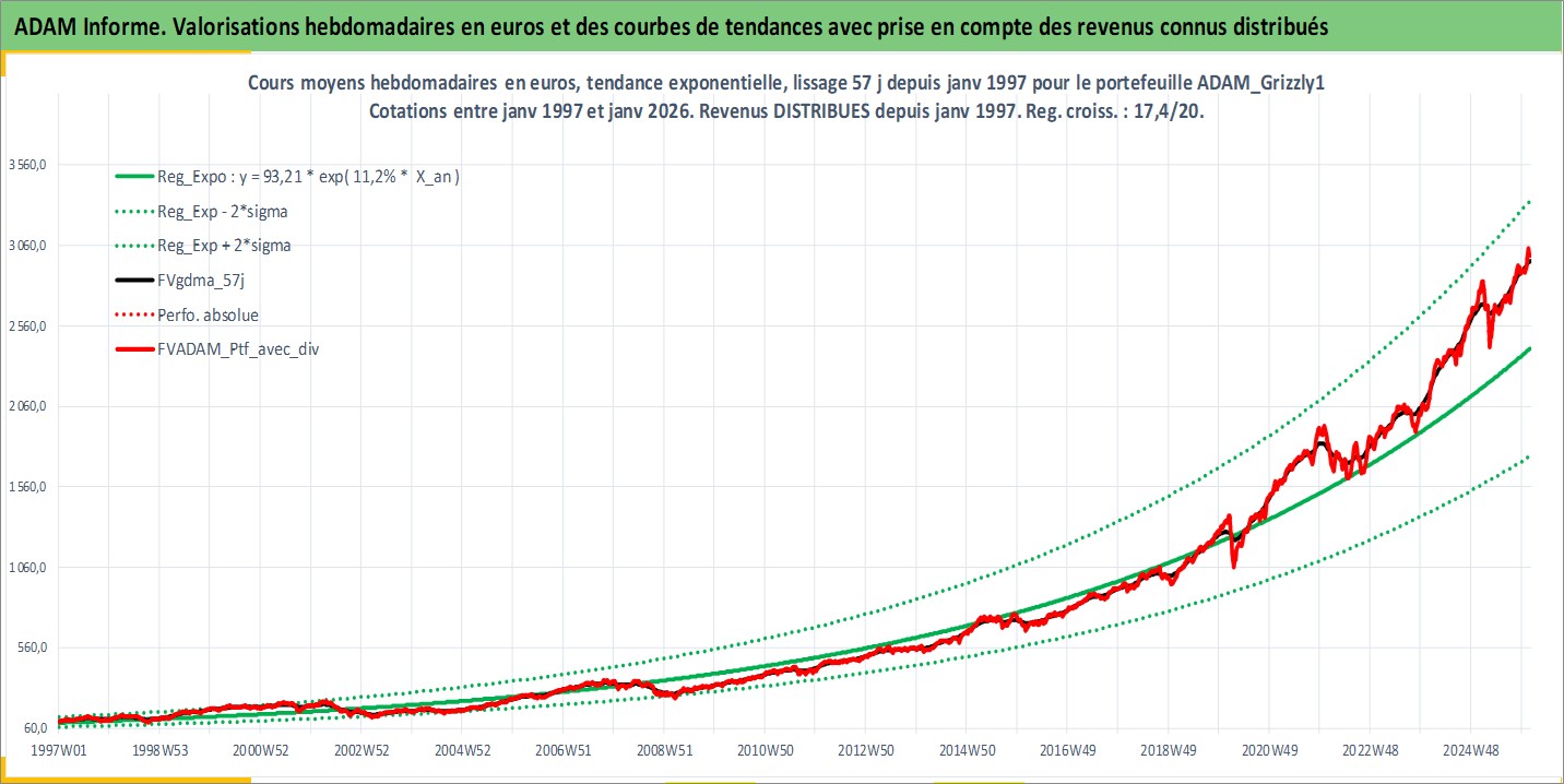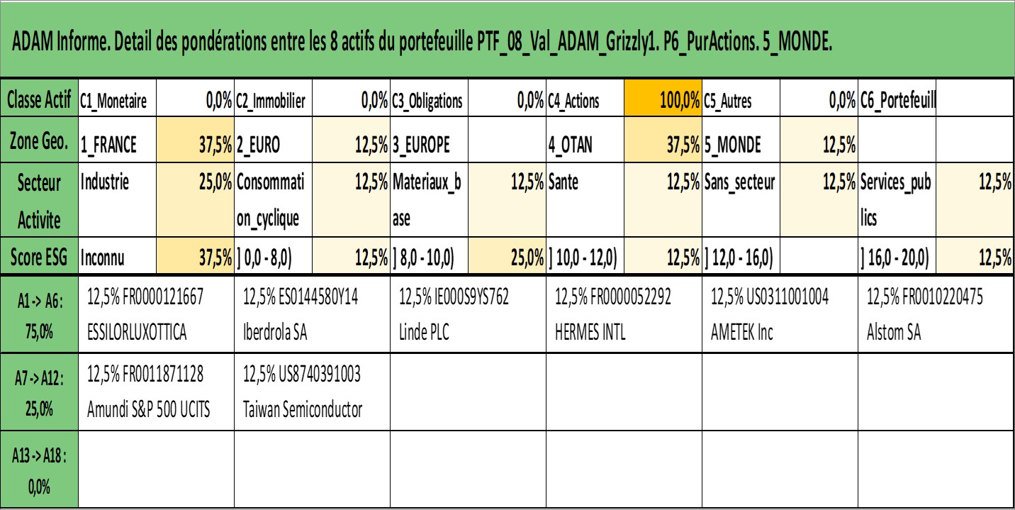 Site dédié aux investisseursPage dédiée sur site financeAnalyse des valorisations hebdomadaires du portefeuille ADAM_Grizzly1_8actifs avec un profil P6_PurActions. Ce portefeuille est cote en EUR. Les valorisations couvrent les semaines 1997W01 a 2026W05. Les revenus de cet actif financier sont pris en compte depuis la semaine 1997W01. La note globale ESG de cet actif est estimee a 11.2 (apres rebasage entre 0 et 20).