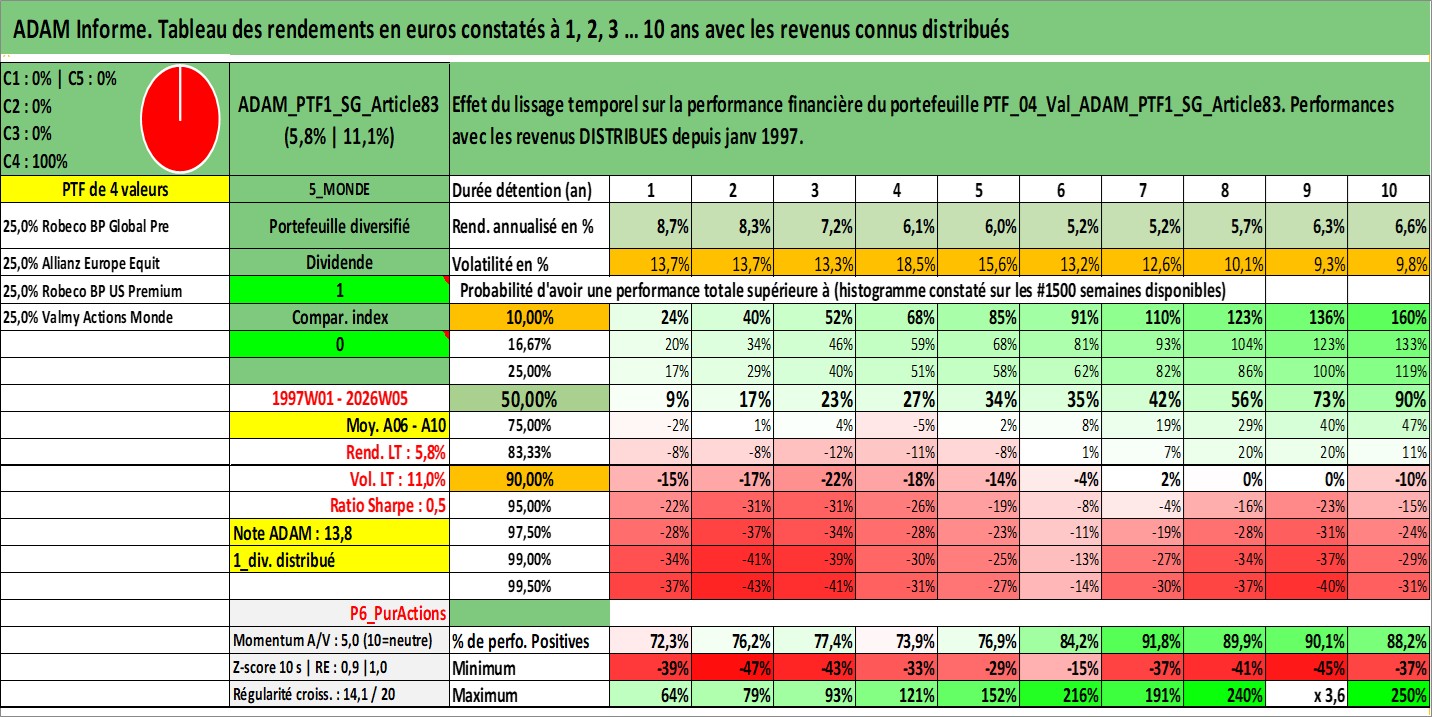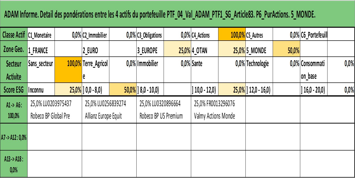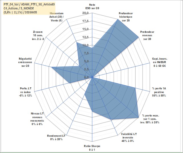 Site dédié aux investisseursPage dédiée sur site financeAnalyse des valorisations hebdomadaires du portefeuille PTF1_SG_Article83_4actifs avec un profil P6_PurActions. Ce portefeuille est cote en EUR. Les valorisations couvrent les semaines 1997W01 a 2026W05. Les revenus de cet actif financier sont pris en compte depuis la semaine 1997W01. La note globale ESG de cet actif est estimee a 9.0 (apres rebasage entre 0 et 20).