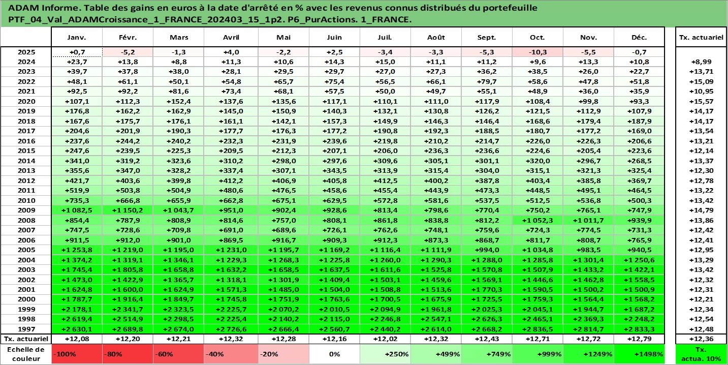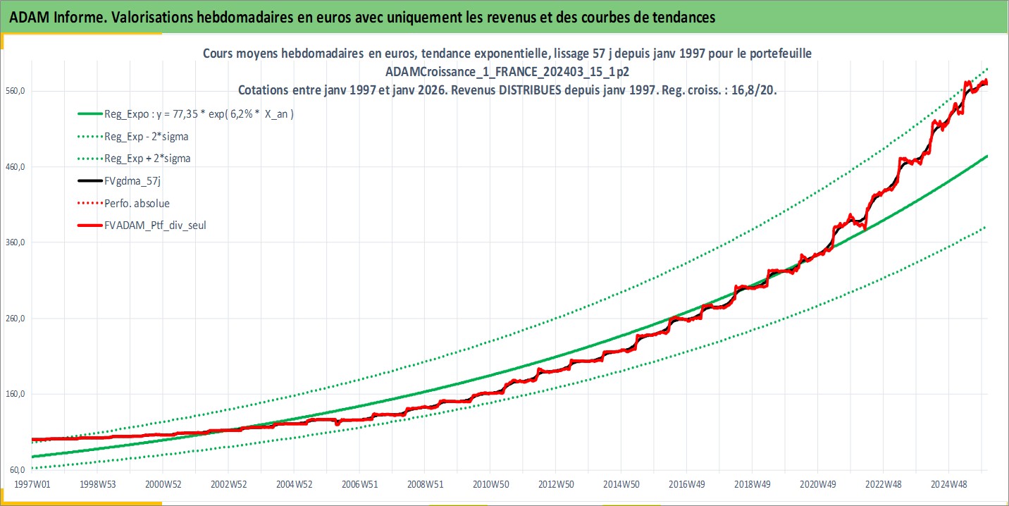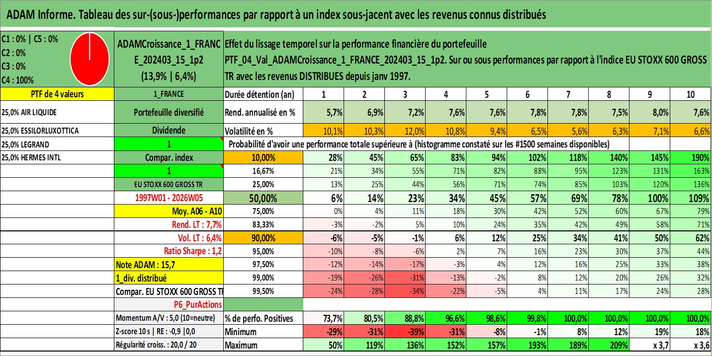 Site dédié aux investisseursPage dédiée sur site financeAnalyse des valorisations hebdomadaires du portefeuille ADAMCroissance_1_FRANCE_202403_15_1p2_4actifs avec un profil P6_PurActions. Ce portefeuille est cote en EUR. Les valorisations couvrent les semaines 1997W01 a 2026W05. Les revenus de cet actif financier sont pris en compte depuis la semaine 1997W01. La note globale ESG de cet actif est estimee a 13.5 (apres rebasage entre 0 et 20).