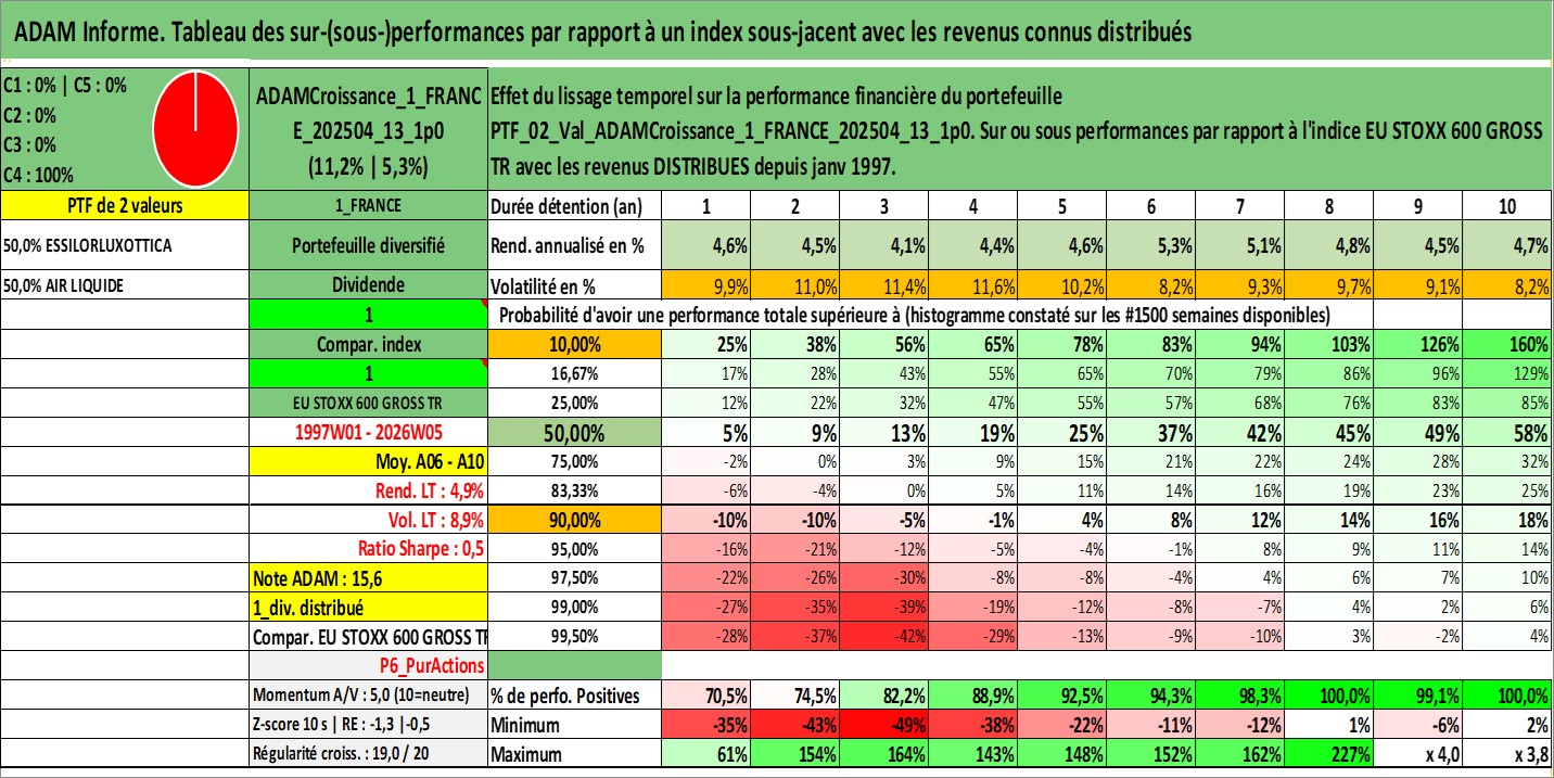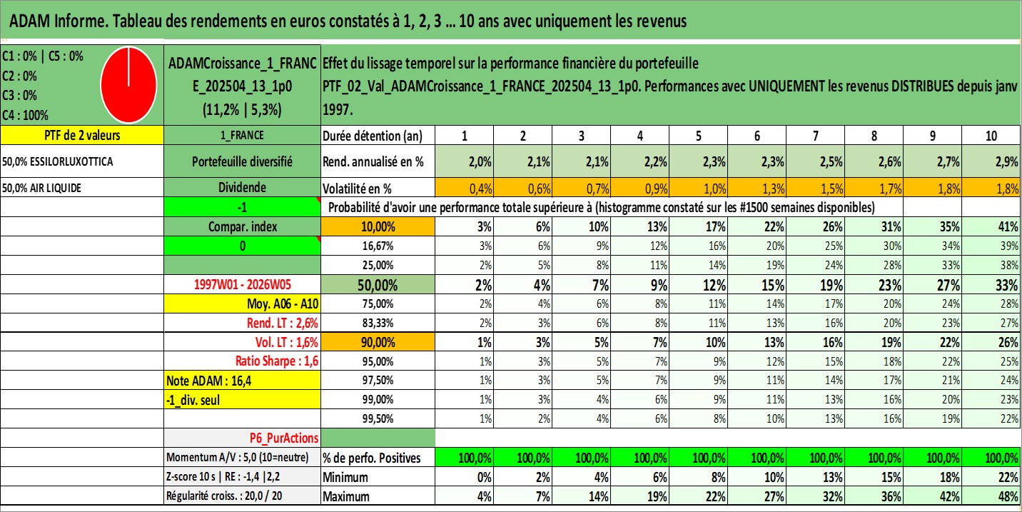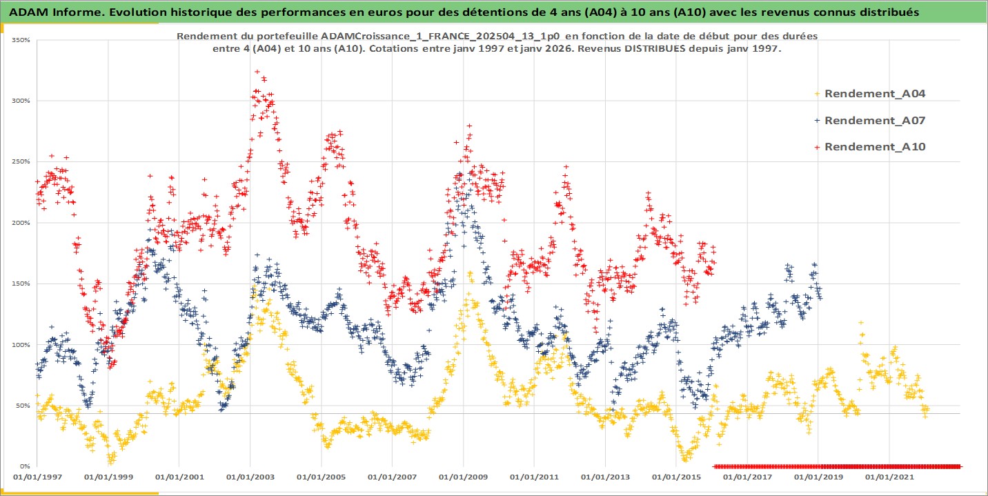 Site dédié aux investisseursPage dédiée sur site financeAnalyse des valorisations hebdomadaires du portefeuille ADAMCroissance_1_FRANCE_202504_13_1p0_2actifs avec un profil P6_PurActions. Ce portefeuille est cote en EUR. Les valorisations couvrent les semaines 1997W01 a 2026W05. Les revenus de cet actif financier sont pris en compte depuis la semaine 1997W01. La note globale ESG de cet actif est estimee a 12.0 (apres rebasage entre 0 et 20).