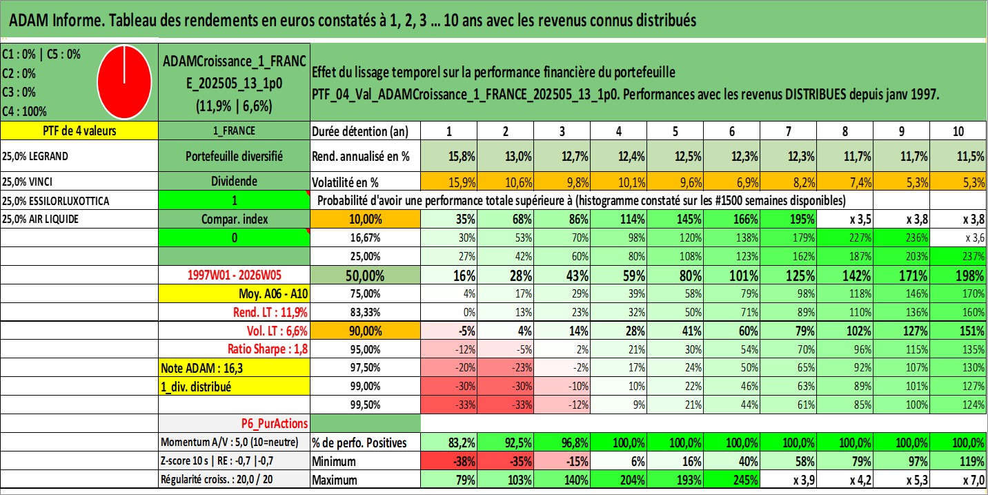 Site dédié aux investisseursPage dédiée sur site financeAnalyse des valorisations hebdomadaires du portefeuille ADAMCroissance_1_FRANCE_202505_13_1p0_4actifs avec un profil P6_PurActions. Ce portefeuille est cote en EUR. Les valorisations couvrent les semaines 1997W01 a 2026W05. Les revenus de cet actif financier sont pris en compte depuis la semaine 1997W01. La note globale ESG de cet actif est estimee a 11.0 (apres rebasage entre 0 et 20).