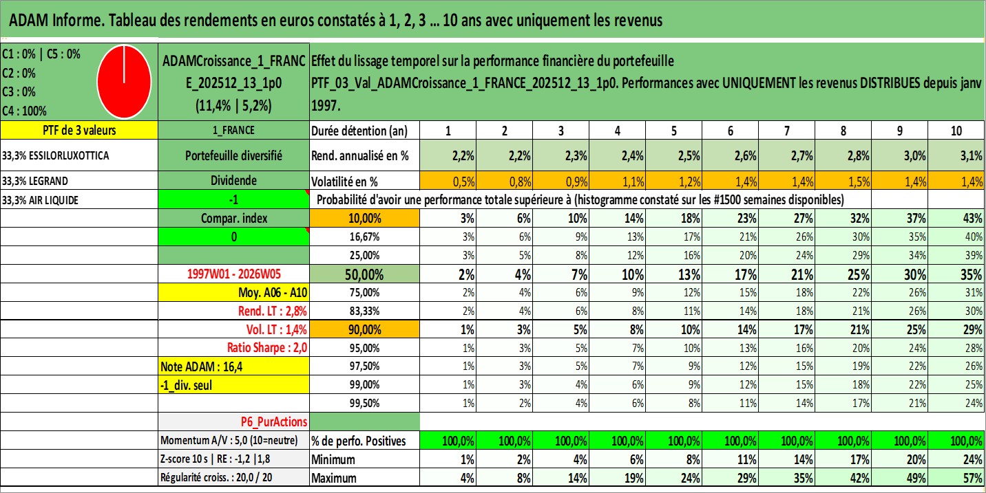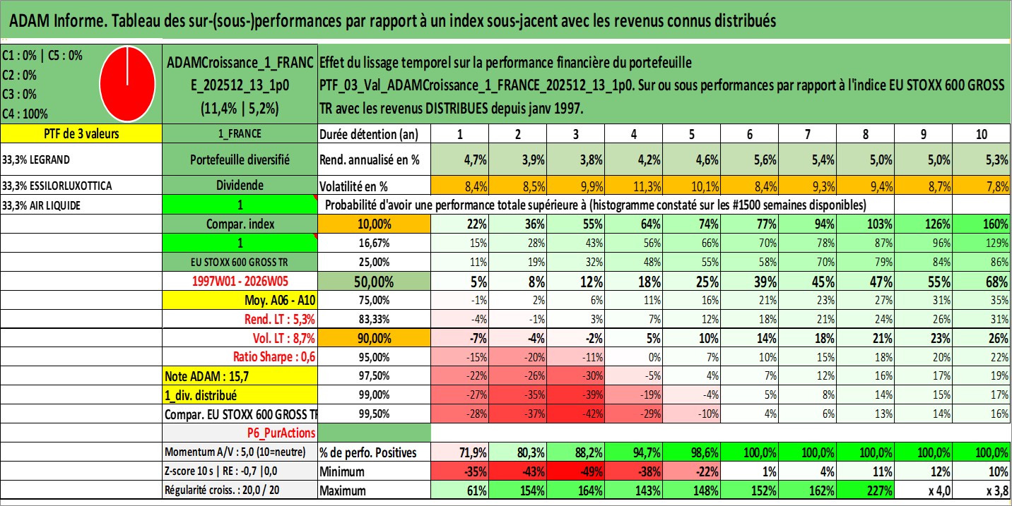Site dédié aux investisseursPage dédiée sur site financeAnalyse des valorisations hebdomadaires du portefeuille ADAMCroissance_1_FRANCE_202512_13_1p0_3actifs avec un profil P6_PurActions. Ce portefeuille est cote en EUR. Les valorisations couvrent les semaines 1997W01 a 2026W05. Les revenus de cet actif financier sont pris en compte depuis la semaine 1997W01. La note globale ESG de cet actif est estimee a 12.3 (apres rebasage entre 0 et 20).