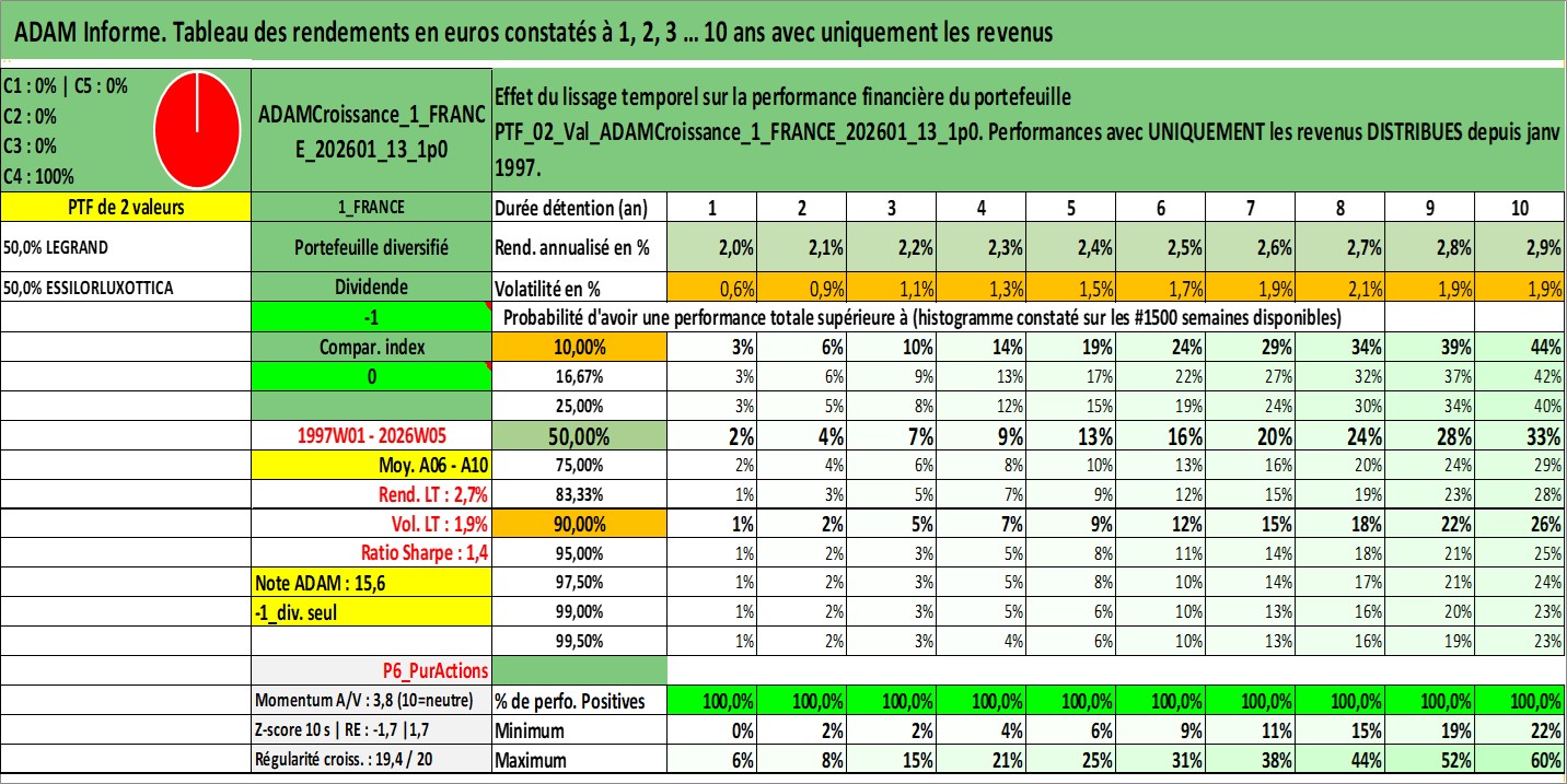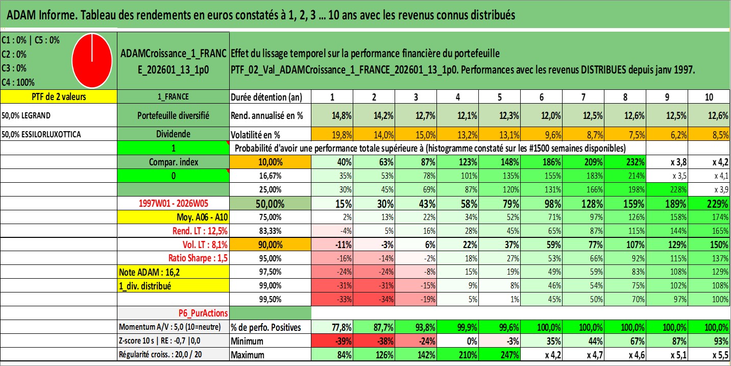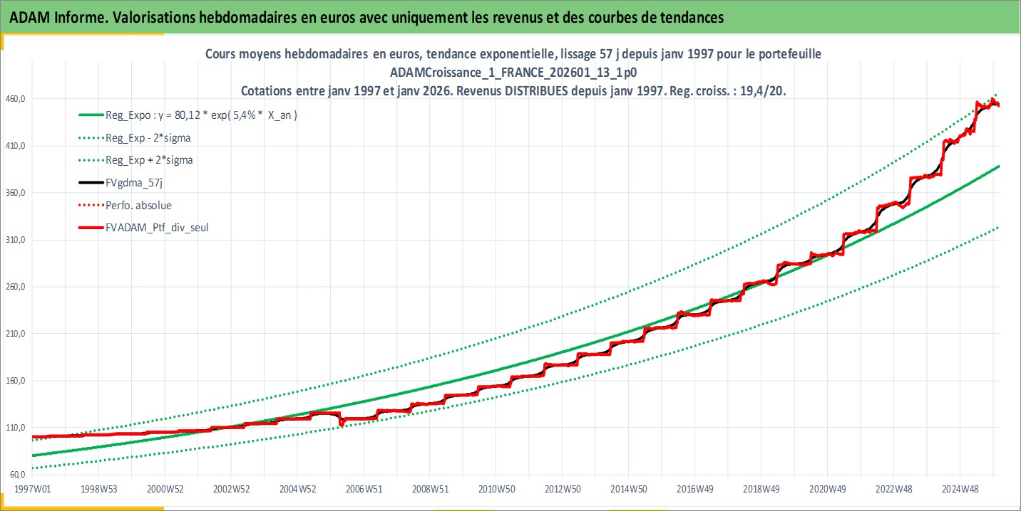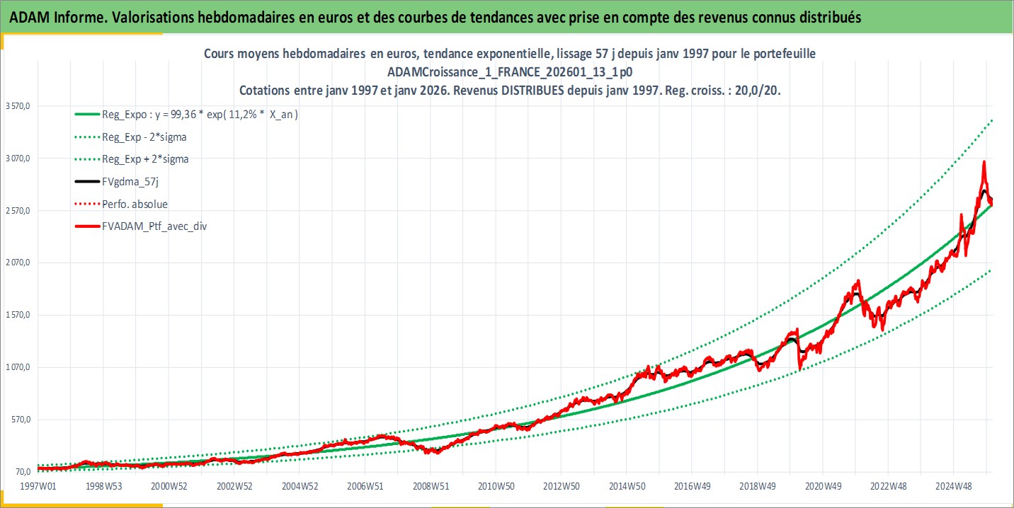 Site dédié aux investisseursPage dédiée sur site financeAnalyse des valorisations hebdomadaires du portefeuille ADAMCroissance_1_FRANCE_202601_13_1p0_2actifs avec un profil P6_PurActions. Ce portefeuille est cote en EUR. Les valorisations couvrent les semaines 1997W01 a 2026W05. Les revenus de cet actif financier sont pris en compte depuis la semaine 1997W01. La note globale ESG de cet actif est estimee a 11.5 (apres rebasage entre 0 et 20).