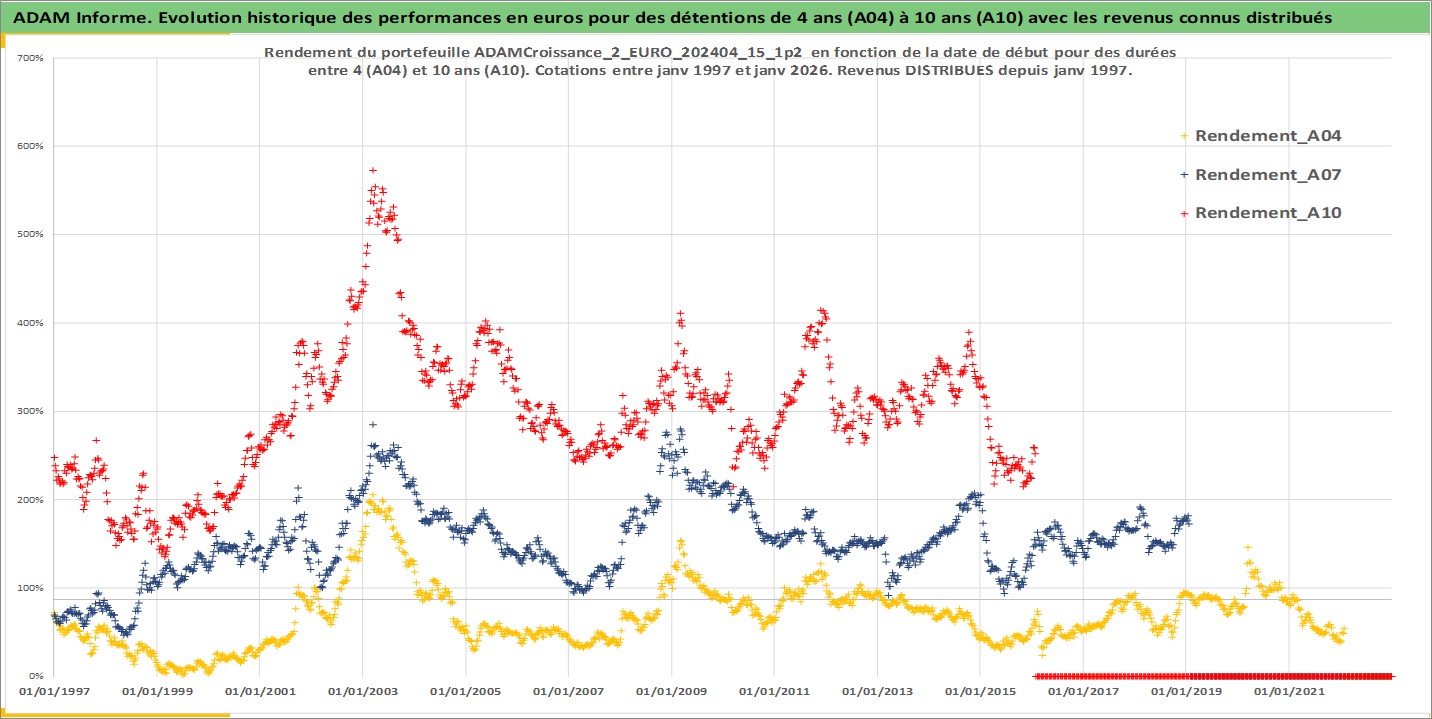 Site dédié aux investisseursPage dédiée sur site financeAnalyse des valorisations hebdomadaires du portefeuille ADAMCroissance_2_EURO_202404_15_1p2_8actifs avec un profil P6_PurActions. Ce portefeuille est cote en EUR. Les valorisations couvrent les semaines 1997W01 a 2026W05. Les revenus de cet actif financier sont pris en compte depuis la semaine 1997W01. La note globale ESG de cet actif est estimee a 14.4 (apres rebasage entre 0 et 20).