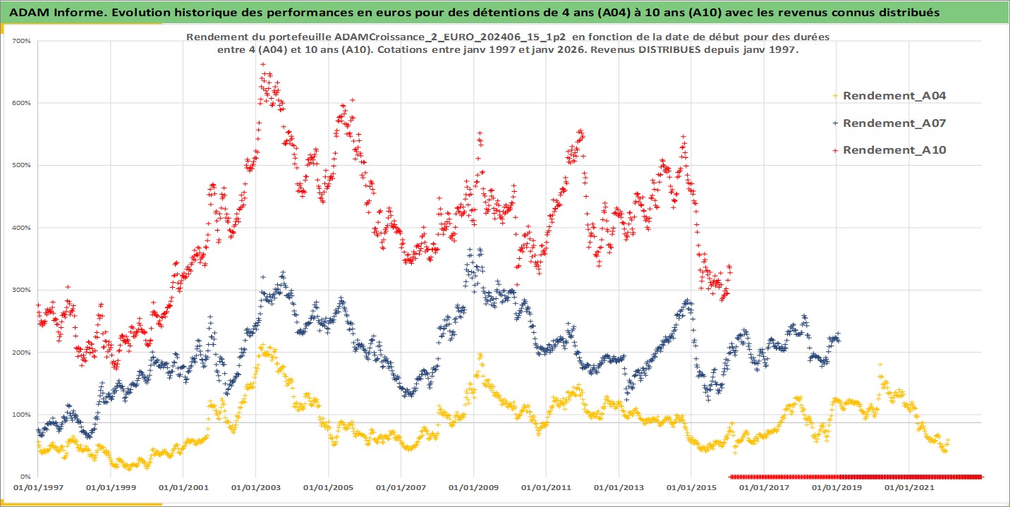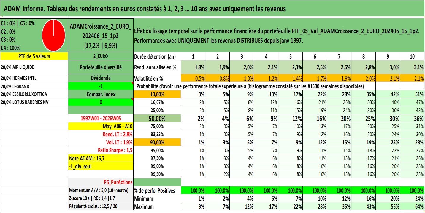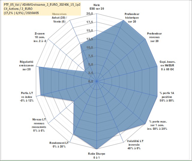 Site dédié aux investisseursPage dédiée sur site financeAnalyse des valorisations hebdomadaires du portefeuille ADAMCroissance_2_EURO_202406_15_1p2_5actifs avec un profil P6_PurActions. Ce portefeuille est cote en EUR. Les valorisations couvrent les semaines 1997W01 a 2026W05. Les revenus de cet actif financier sont pris en compte depuis la semaine 1997W01. La note globale ESG de cet actif est estimee a 13.5 (apres rebasage entre 0 et 20).
