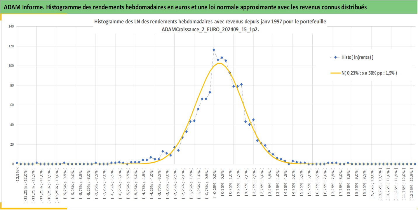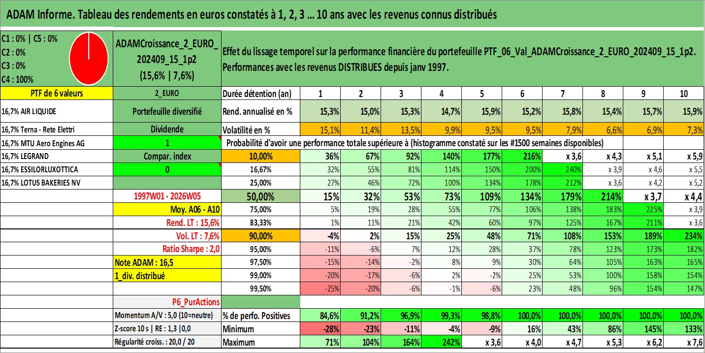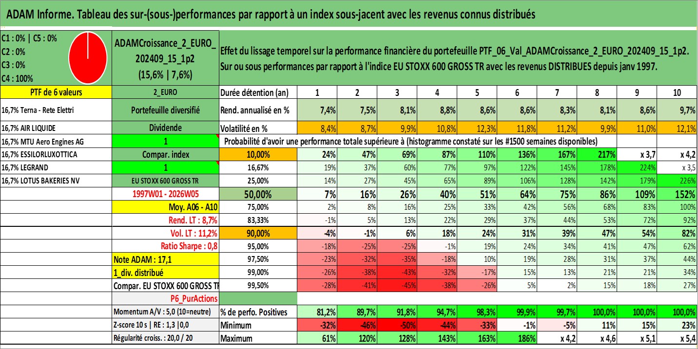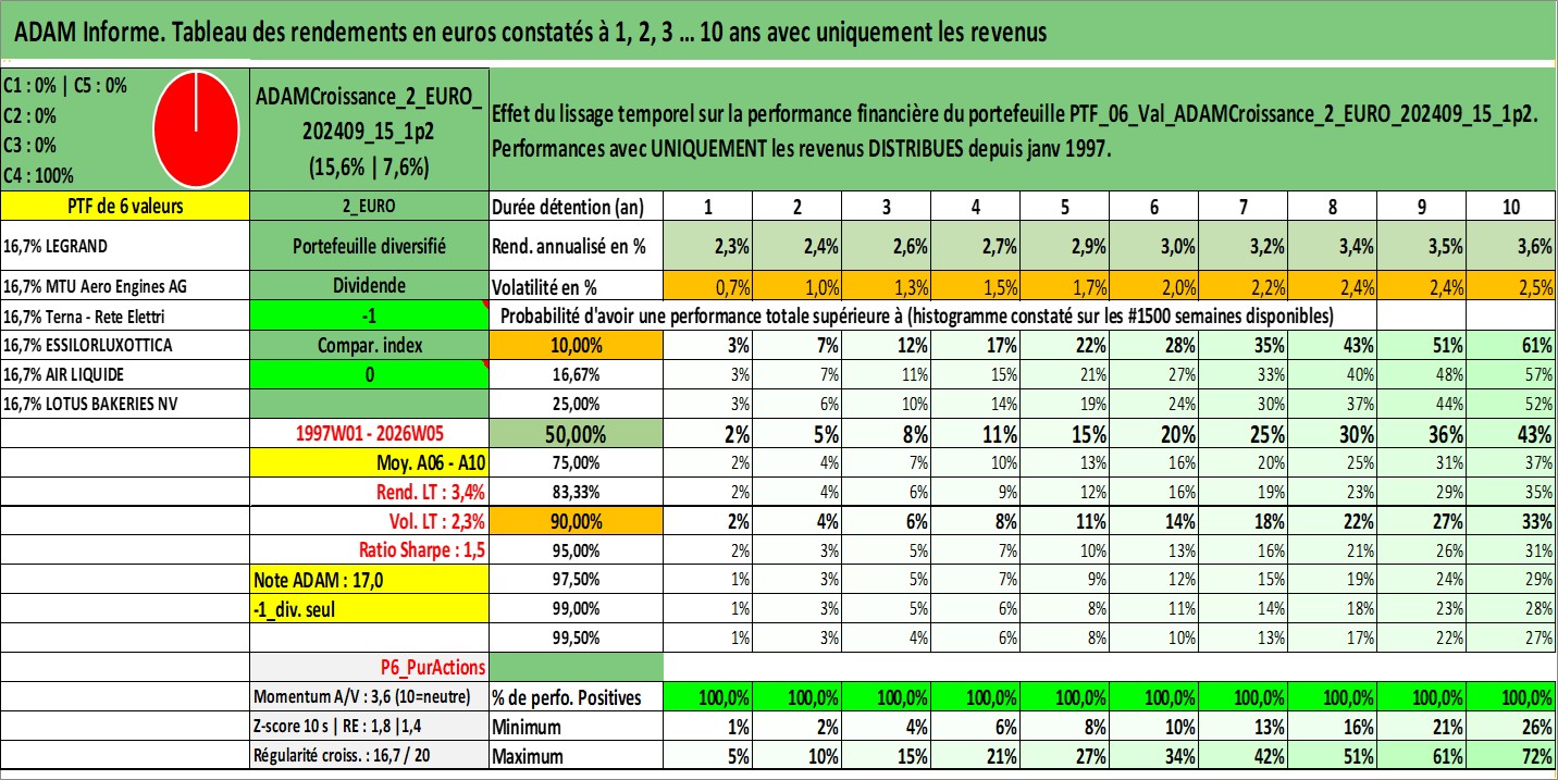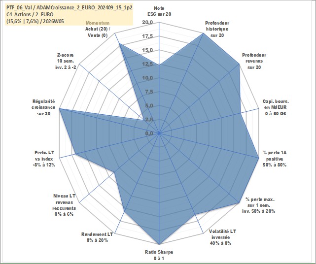 Site dédié aux investisseursPage dédiée sur site financeAnalyse des valorisations hebdomadaires du portefeuille ADAMCroissance_2_EURO_202409_15_1p2_6actifs avec un profil P6_PurActions. Ce portefeuille est cote en EUR. Les valorisations couvrent les semaines 1997W01 a 2026W05. Les revenus de cet actif financier sont pris en compte depuis la semaine 1997W01. La note globale ESG de cet actif est estimee a 12.2 (apres rebasage entre 0 et 20).