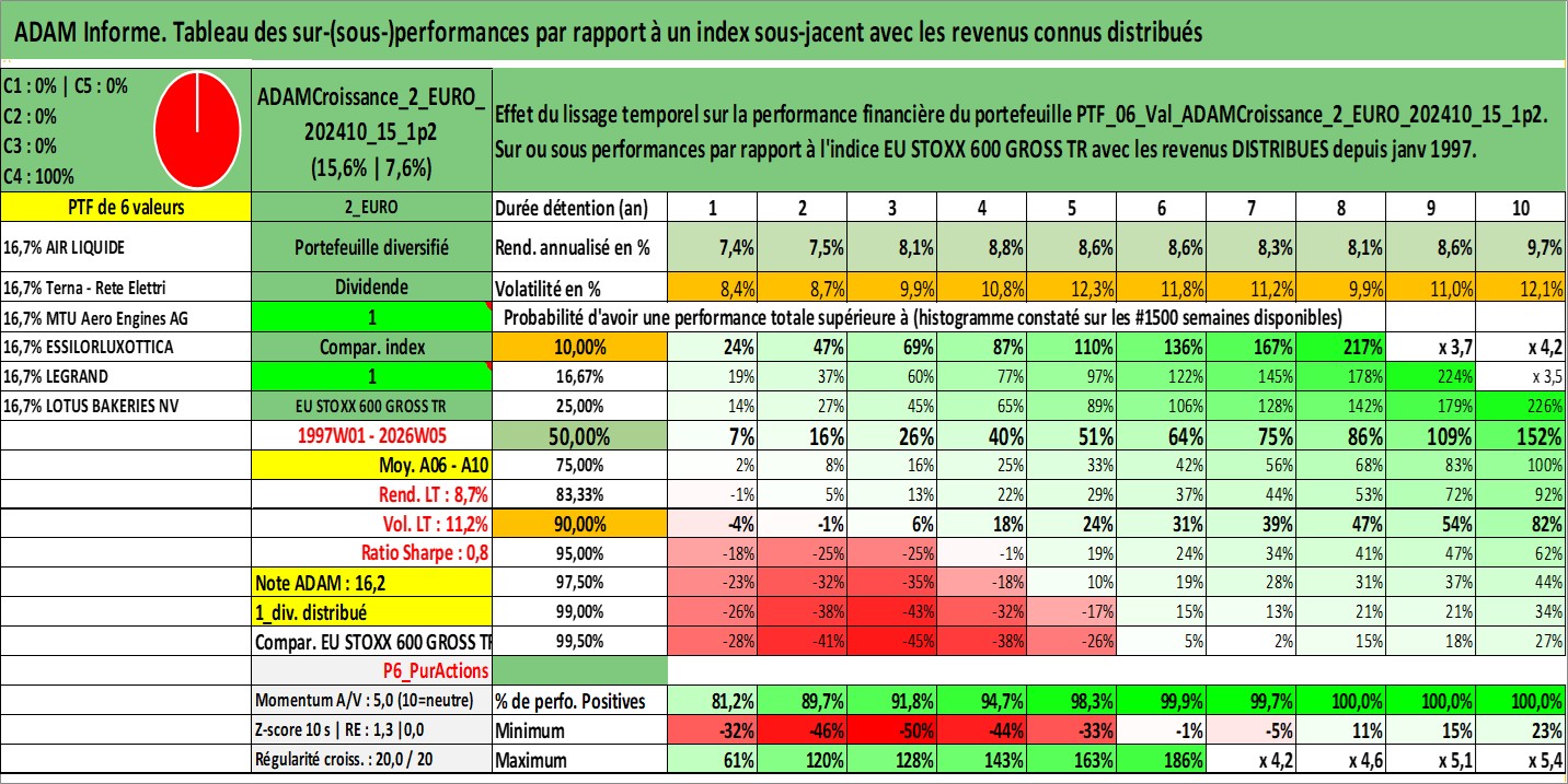Site dédié aux investisseursPage dédiée sur site financeAnalyse des valorisations hebdomadaires du portefeuille ADAMCroissance_2_EURO_202410_15_1p2_6actifs avec un profil P6_PurActions. Ce portefeuille est cote en EUR. Les valorisations couvrent les semaines 1997W01 a 2026W05. Les revenus de cet actif financier sont pris en compte depuis la semaine 1997W01. La note globale ESG de cet actif est estimee a 12.2 (apres rebasage entre 0 et 20).