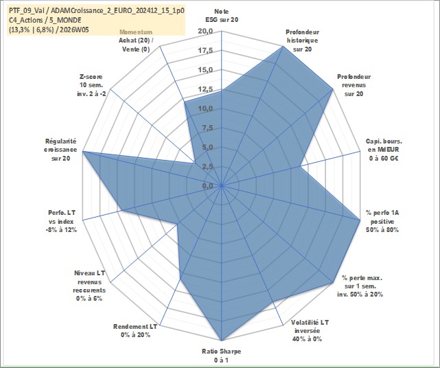 Site dédié aux investisseursPage dédiée sur site financeAnalyse des valorisations hebdomadaires du portefeuille ADAMCroissance_2_EURO_202412_15_1p0_9actifs avec un profil P6_PurActions. Ce portefeuille est cote en EUR. Les valorisations couvrent les semaines 1997W01 a 2026W05. Les revenus de cet actif financier sont pris en compte depuis la semaine 1997W01. La note globale ESG de cet actif est estimee a 12.2 (apres rebasage entre 0 et 20).