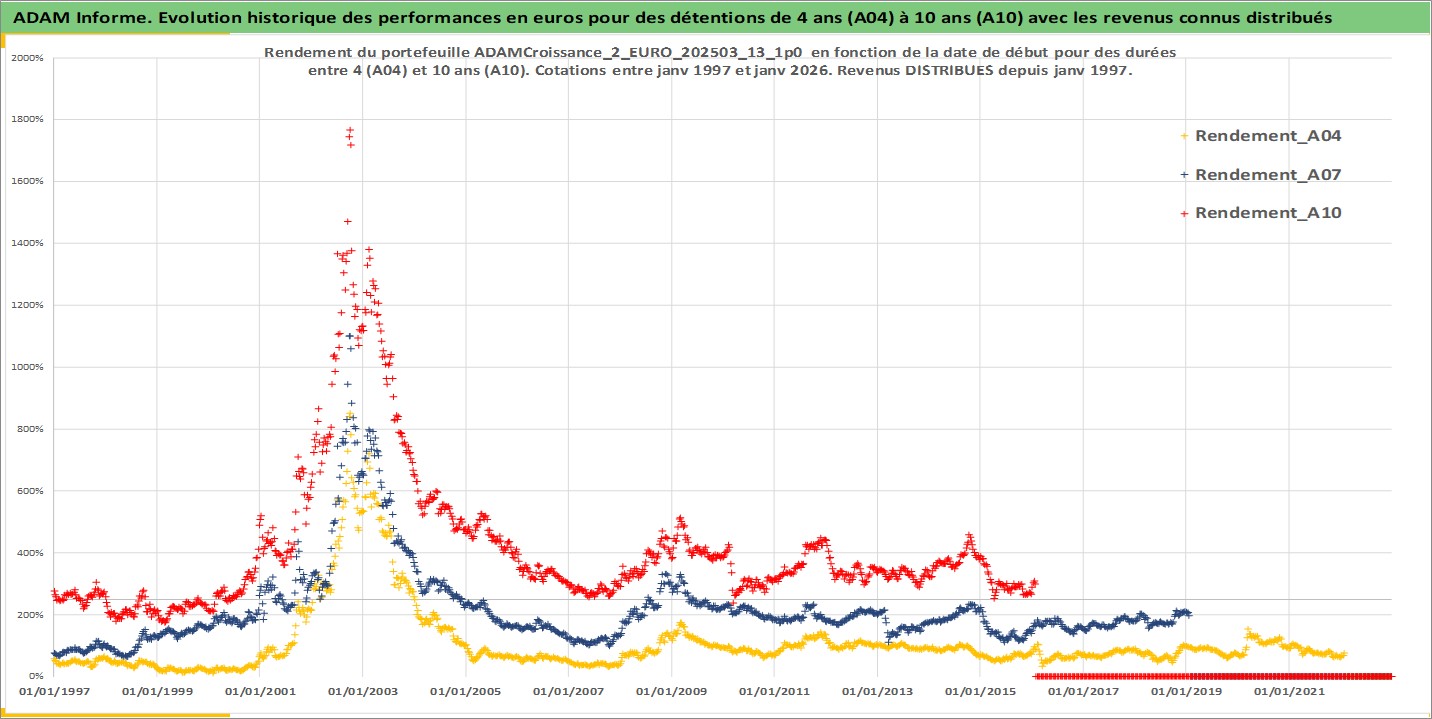 Site dédié aux investisseursPage dédiée sur site financeAnalyse des valorisations hebdomadaires du portefeuille ADAMCroissance_2_EURO_202503_13_1p0_10actifs avec un profil P6_PurActions. Ce portefeuille est cote en EUR. Les valorisations couvrent les semaines 1997W01 a 2026W05. Les revenus de cet actif financier sont pris en compte depuis la semaine 1997W01. La note globale ESG de cet actif est estimee a 12.9 (apres rebasage entre 0 et 20).