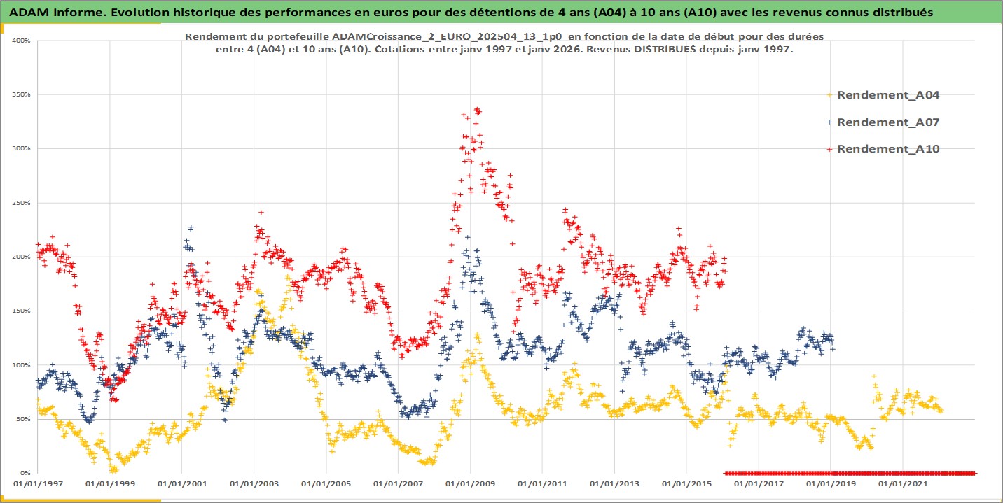 Site dédié aux investisseursPage dédiée sur site financeAnalyse des valorisations hebdomadaires du portefeuille ADAMCroissance_2_EURO_202504_13_1p0_7actifs avec un profil P6_PurActions. Ce portefeuille est cote en EUR. Les valorisations couvrent les semaines 1997W01 a 2026W05. Les revenus de cet actif financier sont pris en compte depuis la semaine 1997W01. La note globale ESG de cet actif est estimee a 12.7 (apres rebasage entre 0 et 20).