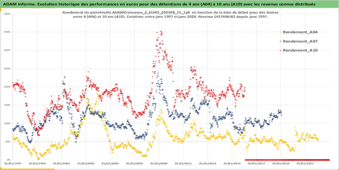 Site dédié aux investisseursPage dédiée sur site financeAnalyse des valorisations hebdomadaires du portefeuille ADAMCroissance_2_EURO_202508_15_1p0_8actifs avec un profil P6_PurActions. Ce portefeuille est cote en EUR. Les valorisations couvrent les semaines 1997W01 a 2026W05. Les revenus de cet actif financier sont pris en compte depuis la semaine 1997W01. La note globale ESG de cet actif est estimee a 12.7 (apres rebasage entre 0 et 20).