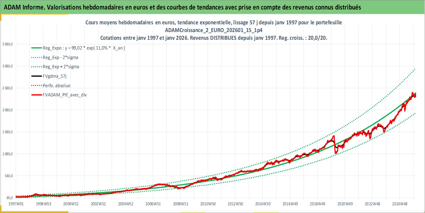 Site dédié aux investisseursPage dédiée sur site financeAnalyse des valorisations hebdomadaires du portefeuille ADAMCroissance_2_EURO_202601_15_1p4_4actifs avec un profil P6_PurActions. Ce portefeuille est cote en EUR. Les valorisations couvrent les semaines 1997W01 a 2026W05. Les revenus de cet actif financier sont pris en compte depuis la semaine 1997W01. La note globale ESG de cet actif est estimee a 11.8 (apres rebasage entre 0 et 20).