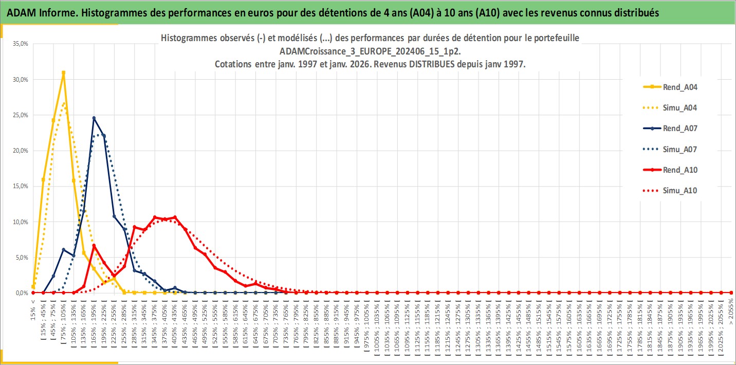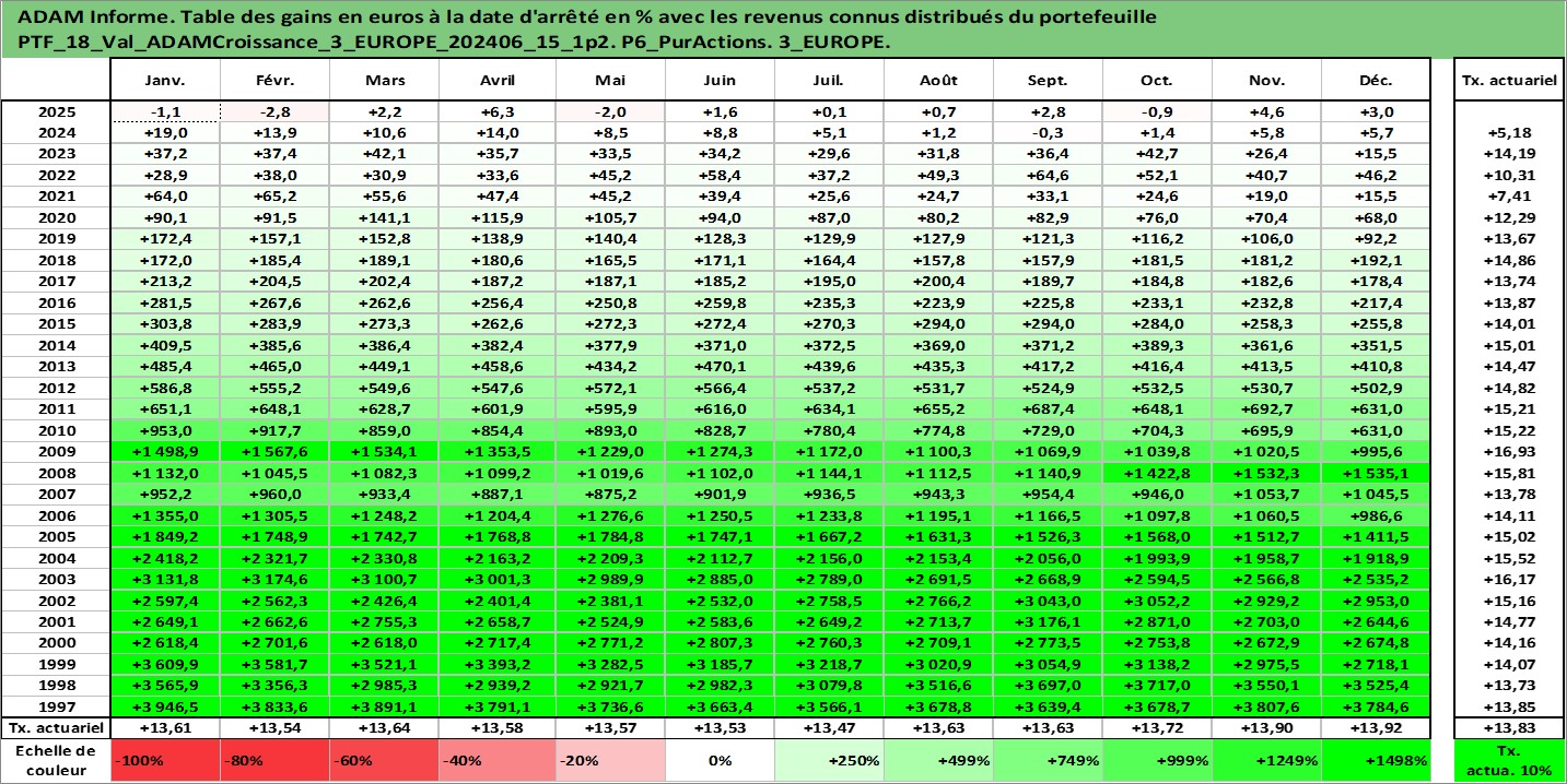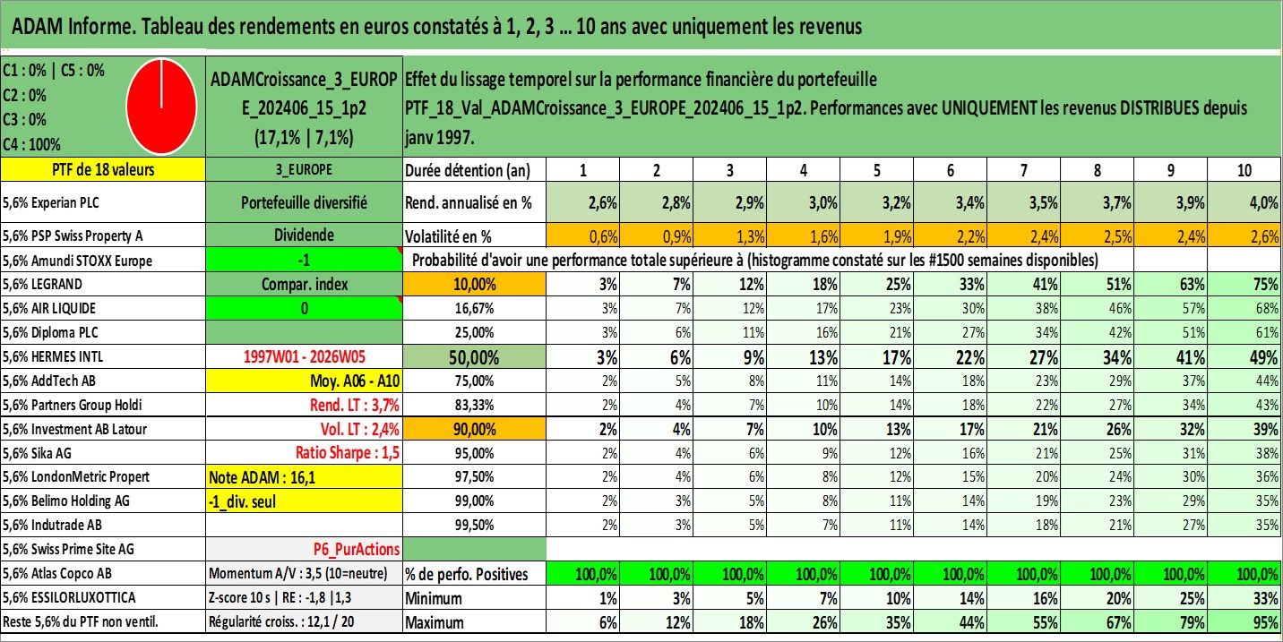 Site dédié aux investisseursPage dédiée sur site financeAnalyse des valorisations hebdomadaires du portefeuille ADAMCroissance_3_EUROPE_202406_15_1p2_18actifs avec un profil P6_PurActions. Ce portefeuille est cote en EUR. Les valorisations couvrent les semaines 1997W01 a 2026W05. Les revenus de cet actif financier sont pris en compte depuis la semaine 1997W01. La note globale ESG de cet actif est estimee a 12.9 (apres rebasage entre 0 et 20).