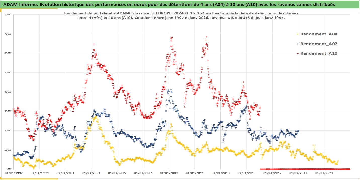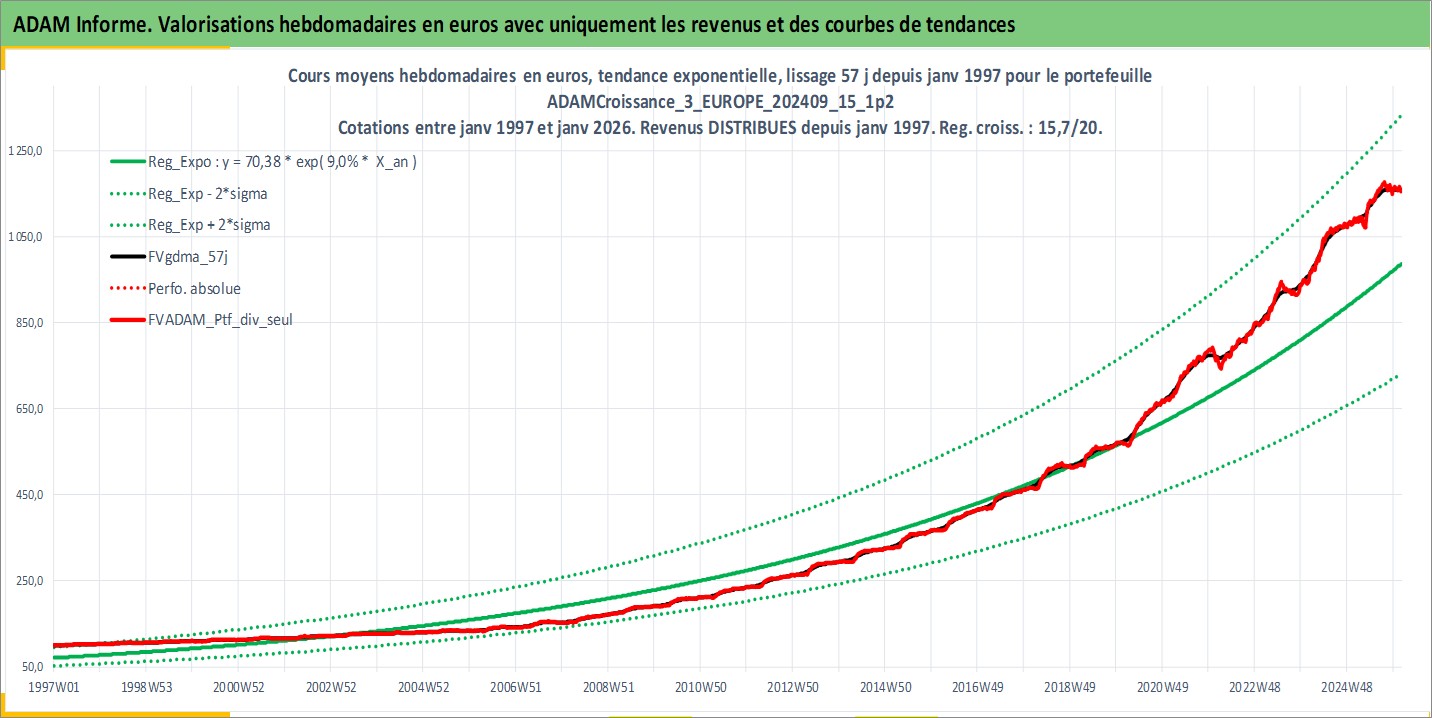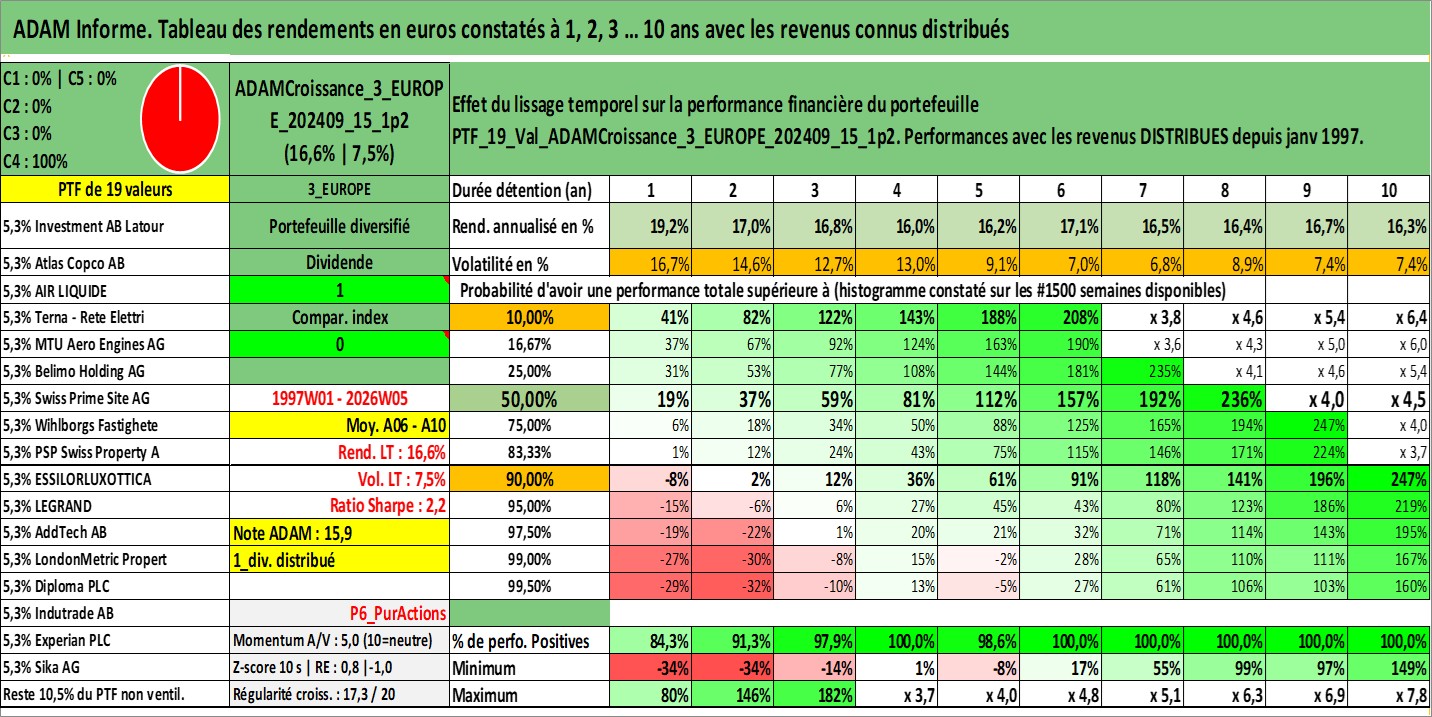 Site dédié aux investisseursPage dédiée sur site financeAnalyse des valorisations hebdomadaires du portefeuille ADAMCroissance_3_EUROPE_202409_15_1p2_19actifs avec un profil P6_PurActions. Ce portefeuille est cote en EUR. Les valorisations couvrent les semaines 1997W01 a 2026W05. Les revenus de cet actif financier sont pris en compte depuis la semaine 1997W01. La note globale ESG de cet actif est estimee a 12.4 (apres rebasage entre 0 et 20).