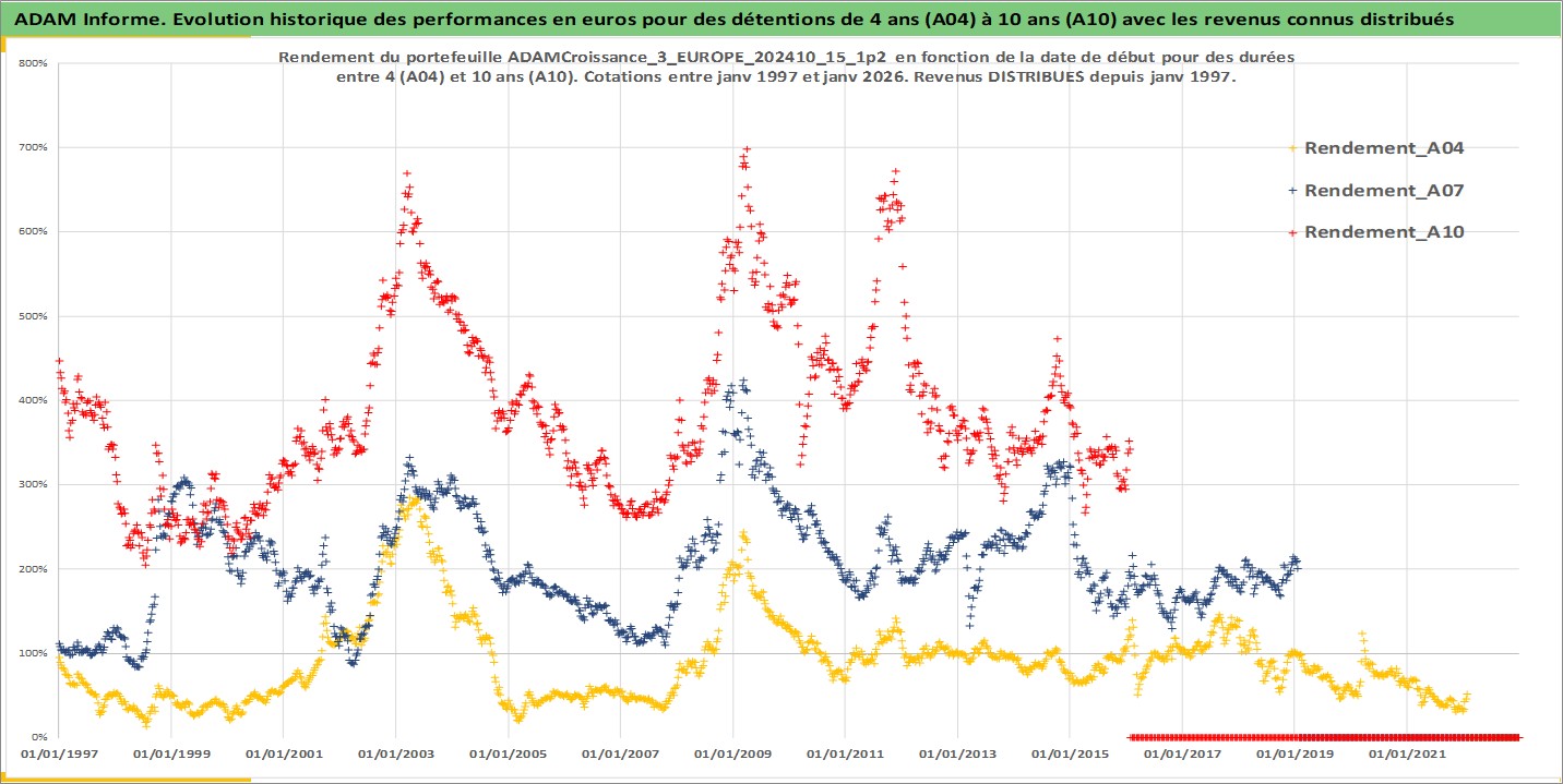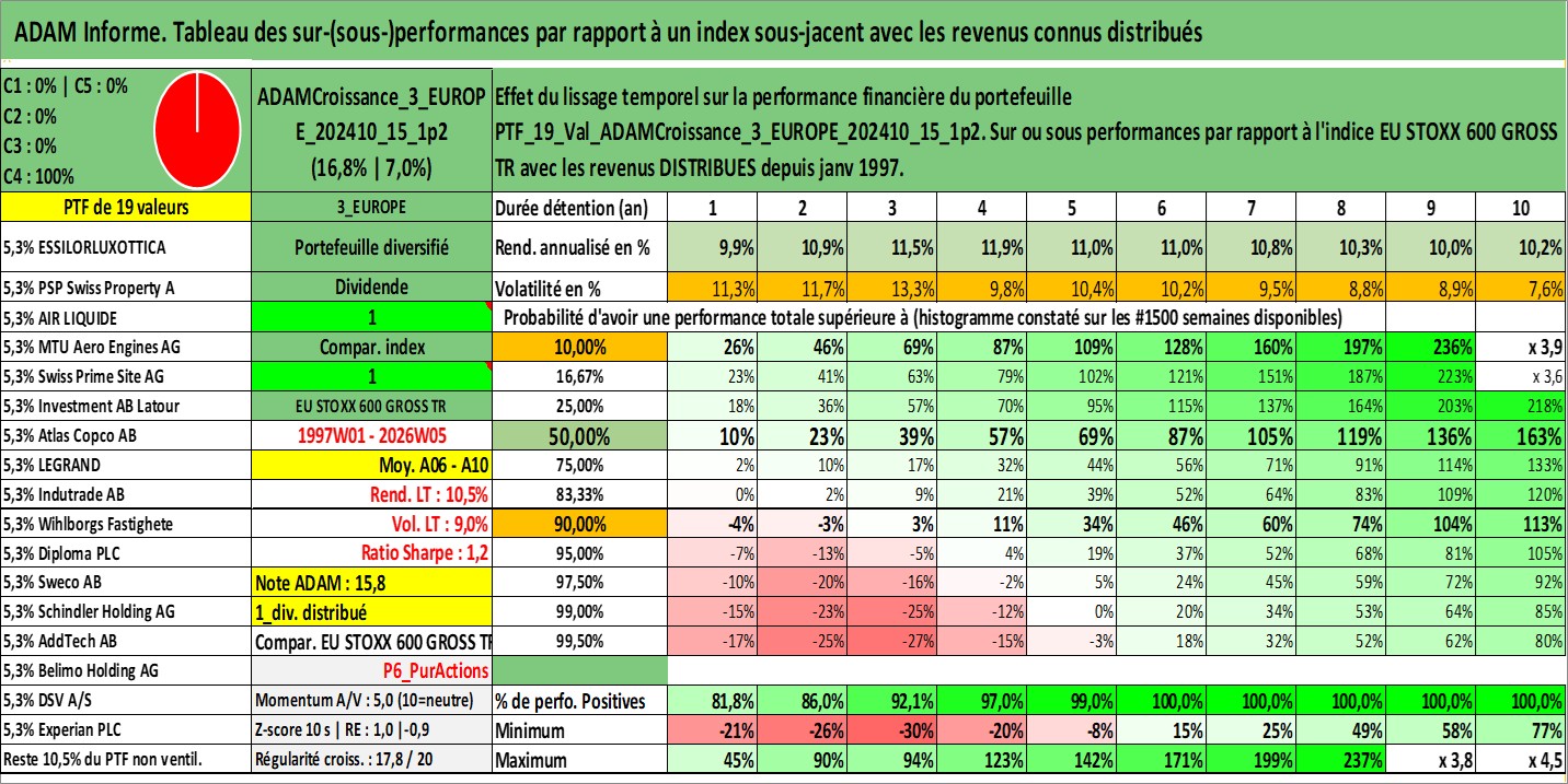 Site dédié aux investisseursPage dédiée sur site financeAnalyse des valorisations hebdomadaires du portefeuille ADAMCroissance_3_EUROPE_202410_15_1p2_19actifs avec un profil P6_PurActions. Ce portefeuille est cote en EUR. Les valorisations couvrent les semaines 1997W01 a 2026W05. Les revenus de cet actif financier sont pris en compte depuis la semaine 1997W01. La note globale ESG de cet actif est estimee a 13.0 (apres rebasage entre 0 et 20).