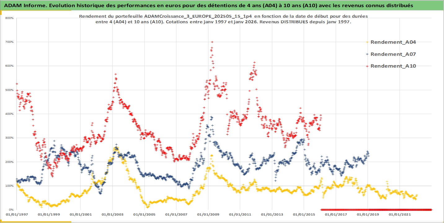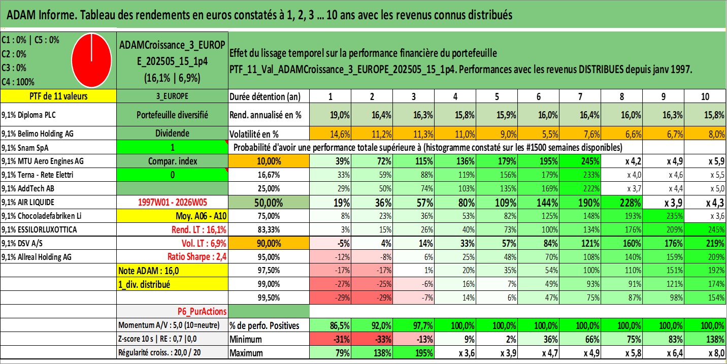 Site dédié aux investisseursPage dédiée sur site financeAnalyse des valorisations hebdomadaires du portefeuille ADAMCroissance_3_EUROPE_202505_15_1p4_11actifs avec un profil P6_PurActions. Ce portefeuille est cote en EUR. Les valorisations couvrent les semaines 1997W01 a 2026W05. Les revenus de cet actif financier sont pris en compte depuis la semaine 1997W01. La note globale ESG de cet actif est estimee a 12.5 (apres rebasage entre 0 et 20).