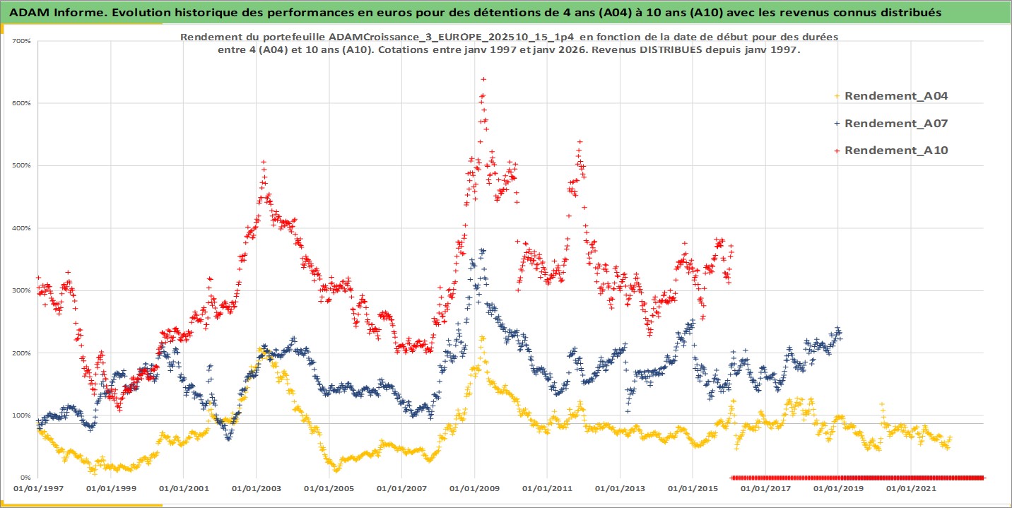 Site dédié aux investisseursPage dédiée sur site financeAnalyse des valorisations hebdomadaires du portefeuille ADAMCroissance_3_EUROPE_202510_15_1p4_10actifs avec un profil P6_PurActions. Ce portefeuille est cote en EUR. Les valorisations couvrent les semaines 1997W01 a 2026W05. Les revenus de cet actif financier sont pris en compte depuis la semaine 1997W01. La note globale ESG de cet actif est estimee a 12.2 (apres rebasage entre 0 et 20).