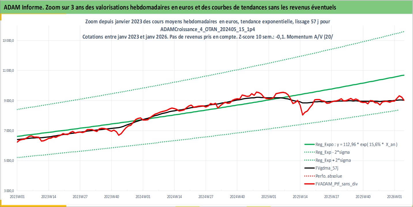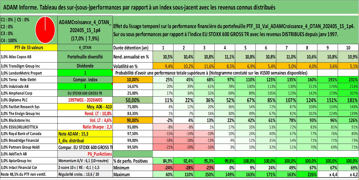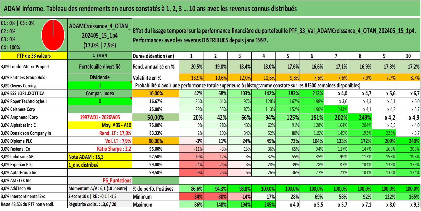 Site dédié aux investisseursPage dédiée sur site financeAnalyse des valorisations hebdomadaires du portefeuille ADAMCroissance_4_OTAN_202405_15_1p4_33actifs avec un profil P6_PurActions. Ce portefeuille est cote en EUR. Les valorisations couvrent les semaines 1997W01 a 2026W05. Les revenus de cet actif financier sont pris en compte depuis la semaine 1997W01. La note globale ESG de cet actif est estimee a 10.4 (apres rebasage entre 0 et 20).