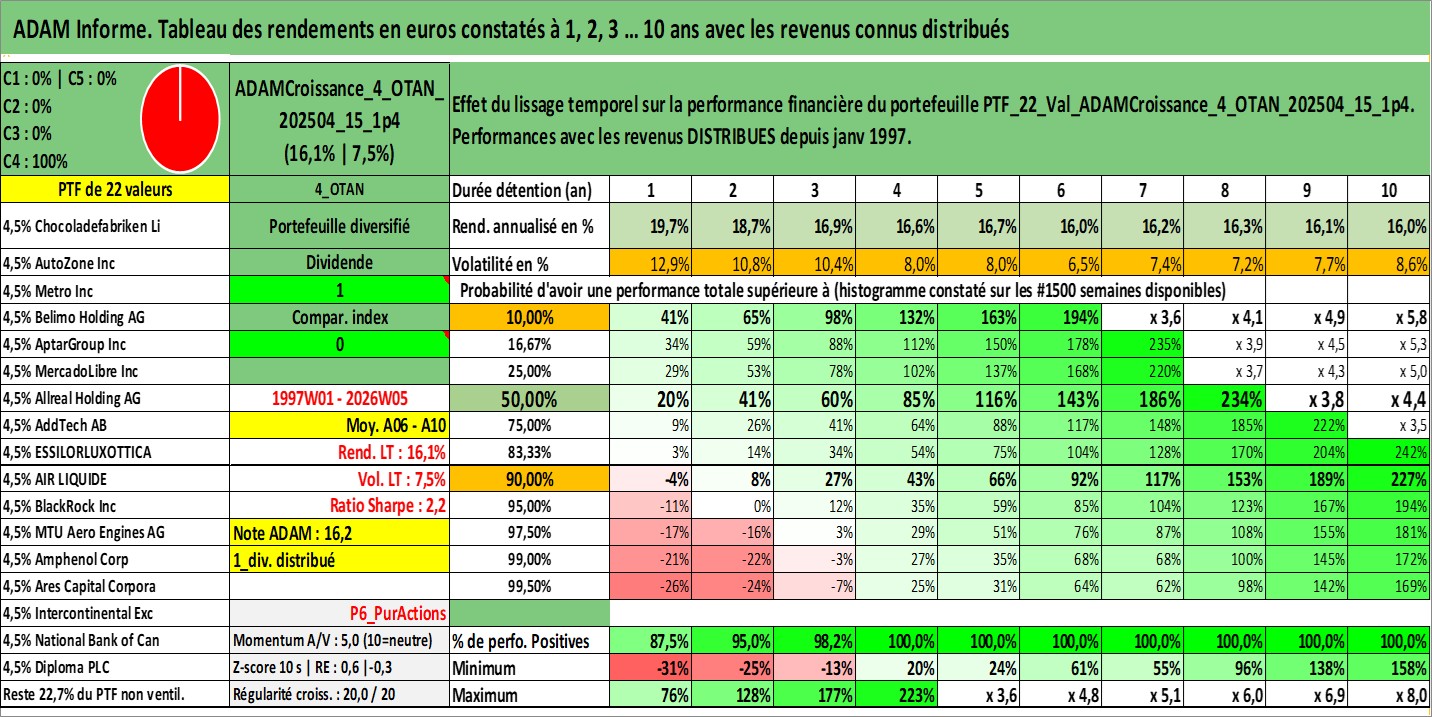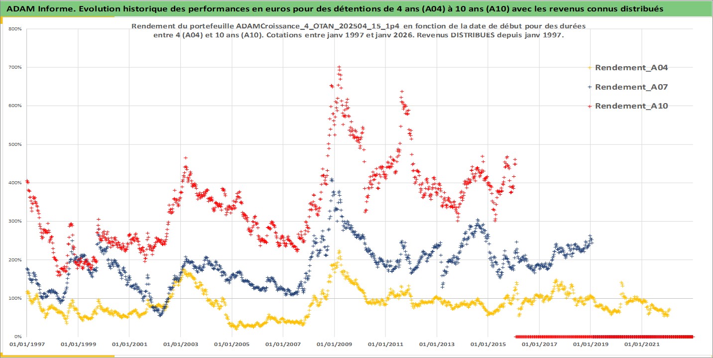 Site dédié aux investisseursPage dédiée sur site financeAnalyse des valorisations hebdomadaires du portefeuille ADAMCroissance_4_OTAN_202504_15_1p4_22actifs avec un profil P6_PurActions. Ce portefeuille est cote en EUR. Les valorisations couvrent les semaines 1997W01 a 2026W05. Les revenus de cet actif financier sont pris en compte depuis la semaine 1997W01. La note globale ESG de cet actif est estimee a 11.4 (apres rebasage entre 0 et 20).