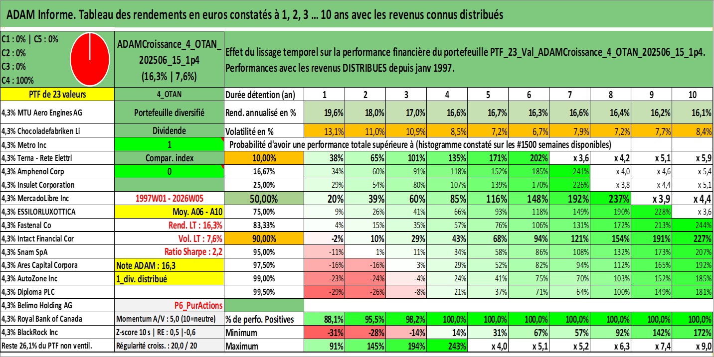Site dédié aux investisseursPage dédiée sur site financeAnalyse des valorisations hebdomadaires du portefeuille ADAMCroissance_4_OTAN_202506_15_1p4_23actifs avec un profil P6_PurActions. Ce portefeuille est cote en EUR. Les valorisations couvrent les semaines 1997W01 a 2026W05. Les revenus de cet actif financier sont pris en compte depuis la semaine 1997W01. La note globale ESG de cet actif est estimee a 11.9 (apres rebasage entre 0 et 20).