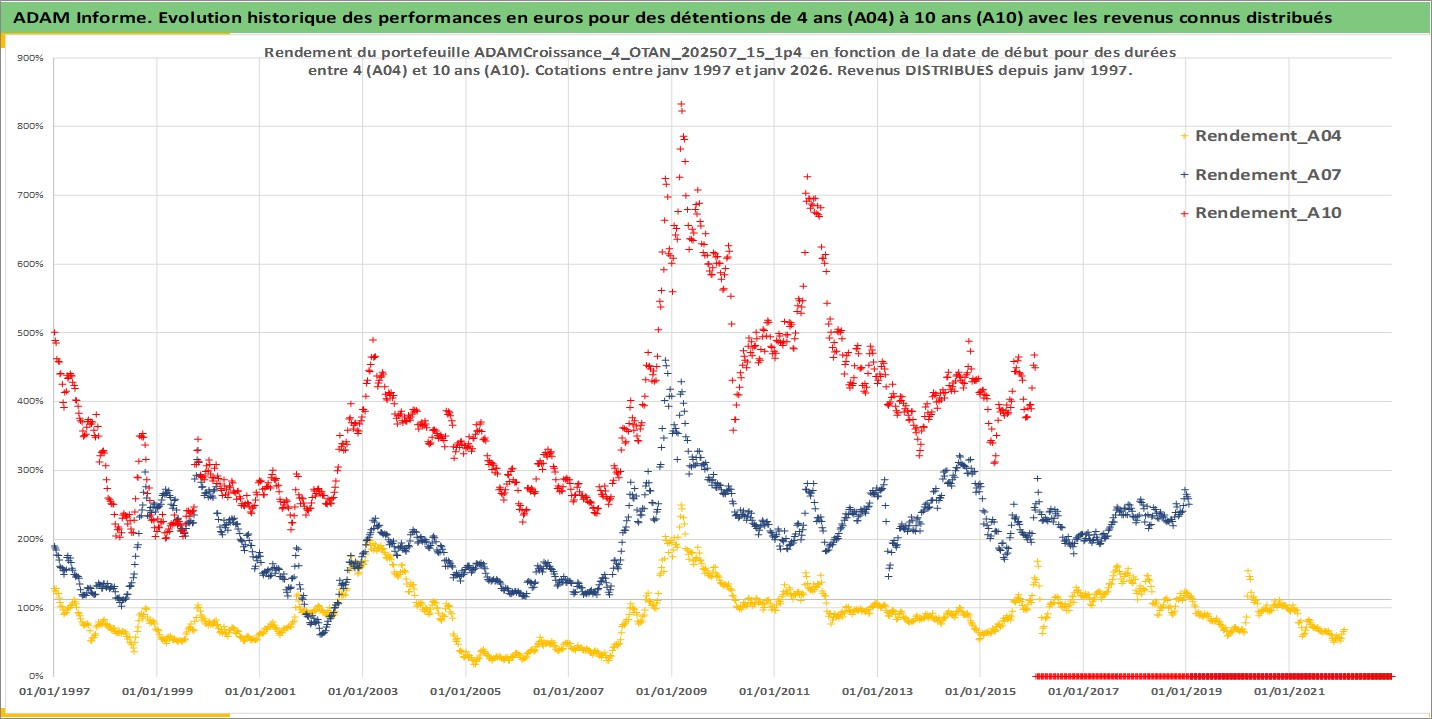 Site dédié aux investisseursPage dédiée sur site financeAnalyse des valorisations hebdomadaires du portefeuille ADAMCroissance_4_OTAN_202507_15_1p4_30actifs avec un profil P6_PurActions. Ce portefeuille est cote en EUR. Les valorisations couvrent les semaines 1997W01 a 2026W05. Les revenus de cet actif financier sont pris en compte depuis la semaine 1997W01. La note globale ESG de cet actif est estimee a 10.9 (apres rebasage entre 0 et 20).