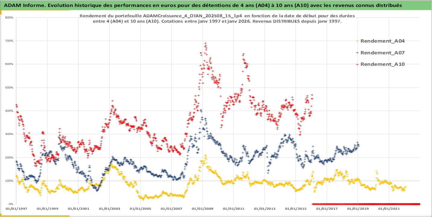 Site dédié aux investisseursPage dédiée sur site financeAnalyse des valorisations hebdomadaires du portefeuille ADAMCroissance_4_OTAN_202508_15_1p4_25actifs avec un profil P6_PurActions. Ce portefeuille est cote en EUR. Les valorisations couvrent les semaines 1997W01 a 2026W05. Les revenus de cet actif financier sont pris en compte depuis la semaine 1997W01. La note globale ESG de cet actif est estimee a 11.9 (apres rebasage entre 0 et 20).